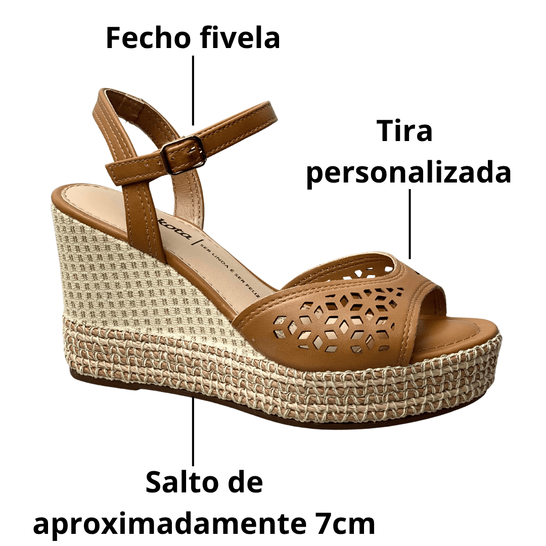 O salto anabela garante estabilidade e conforto, oferecendo altura sem abrir mão da leveza.