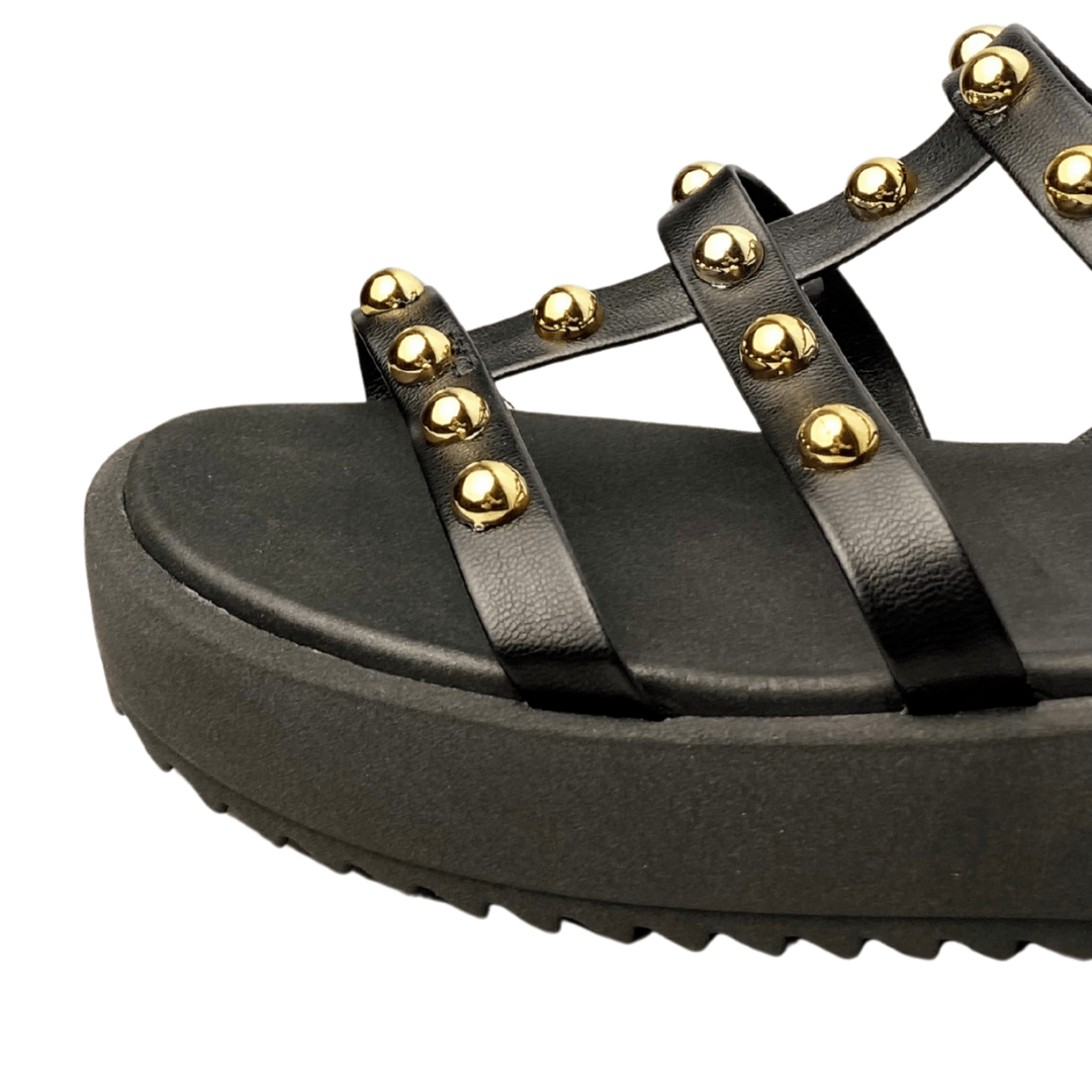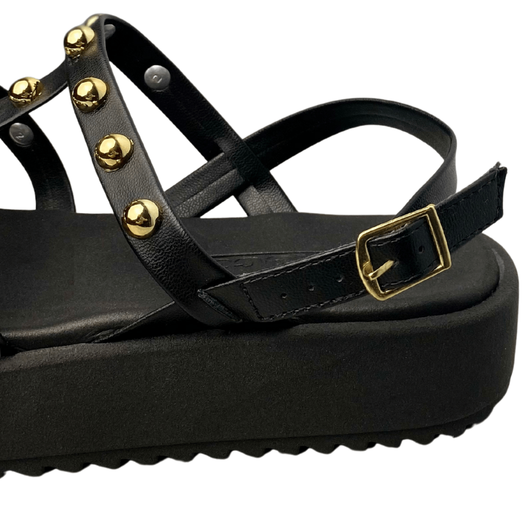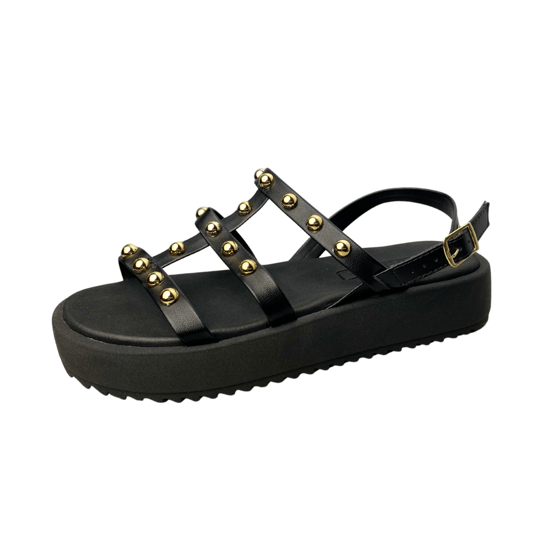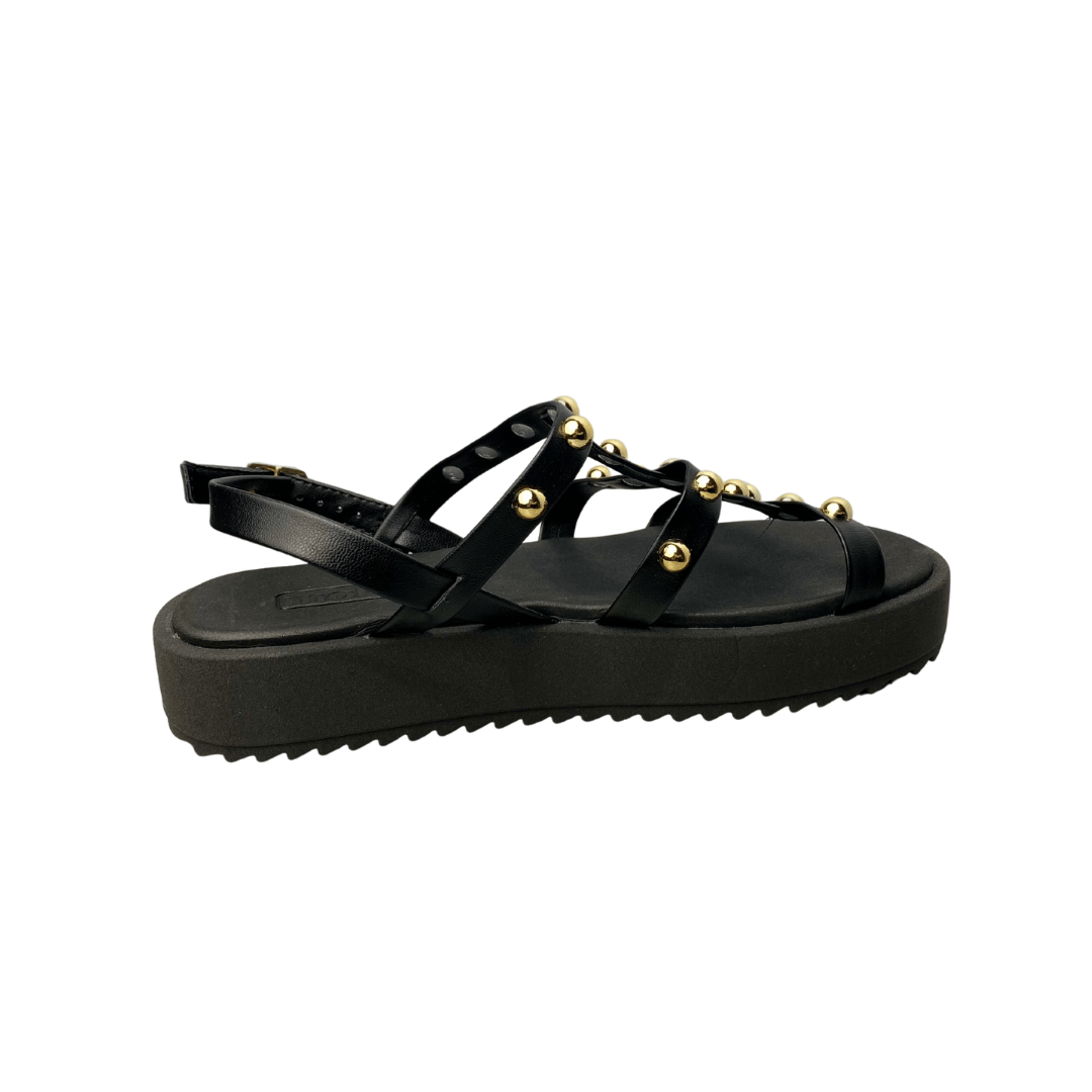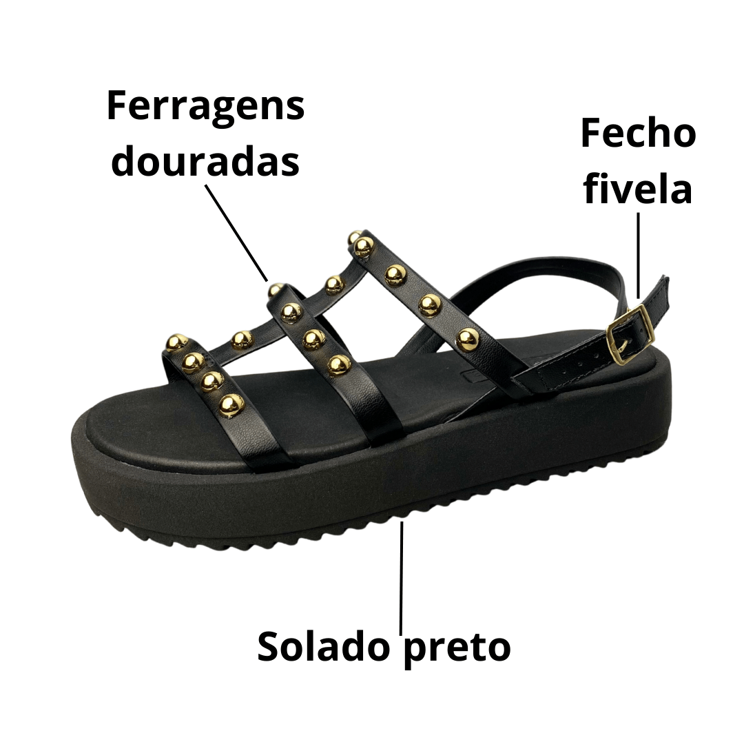 Sandália Flat Moleca Feminina Preta com Ferragens Douradas