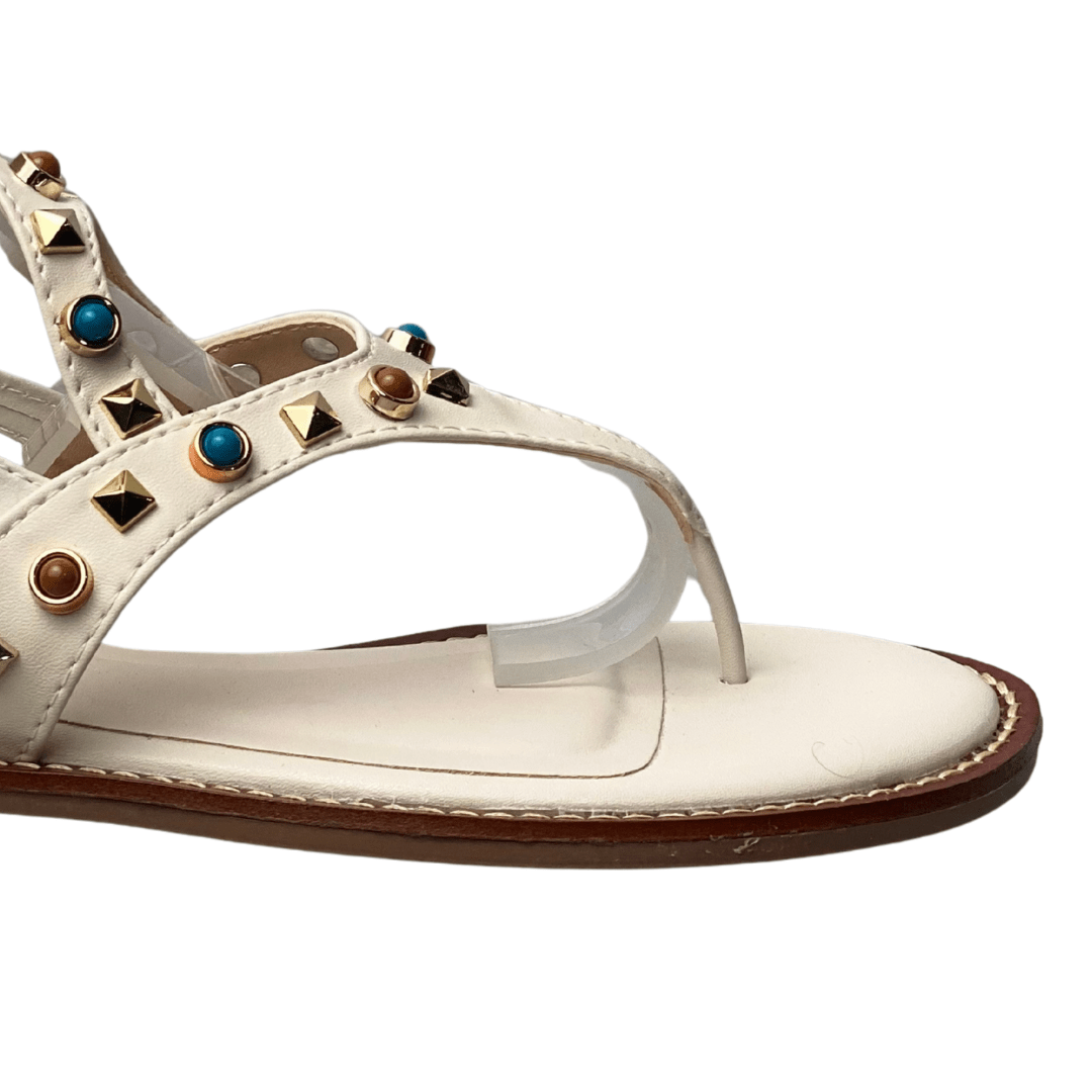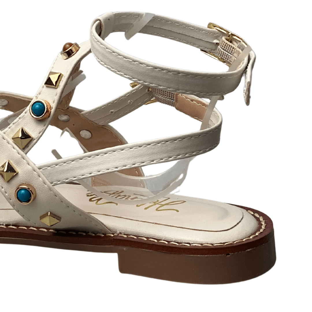Detalhes: Pedrarias turquesa e tachas metálicas aplicadas nas tiras