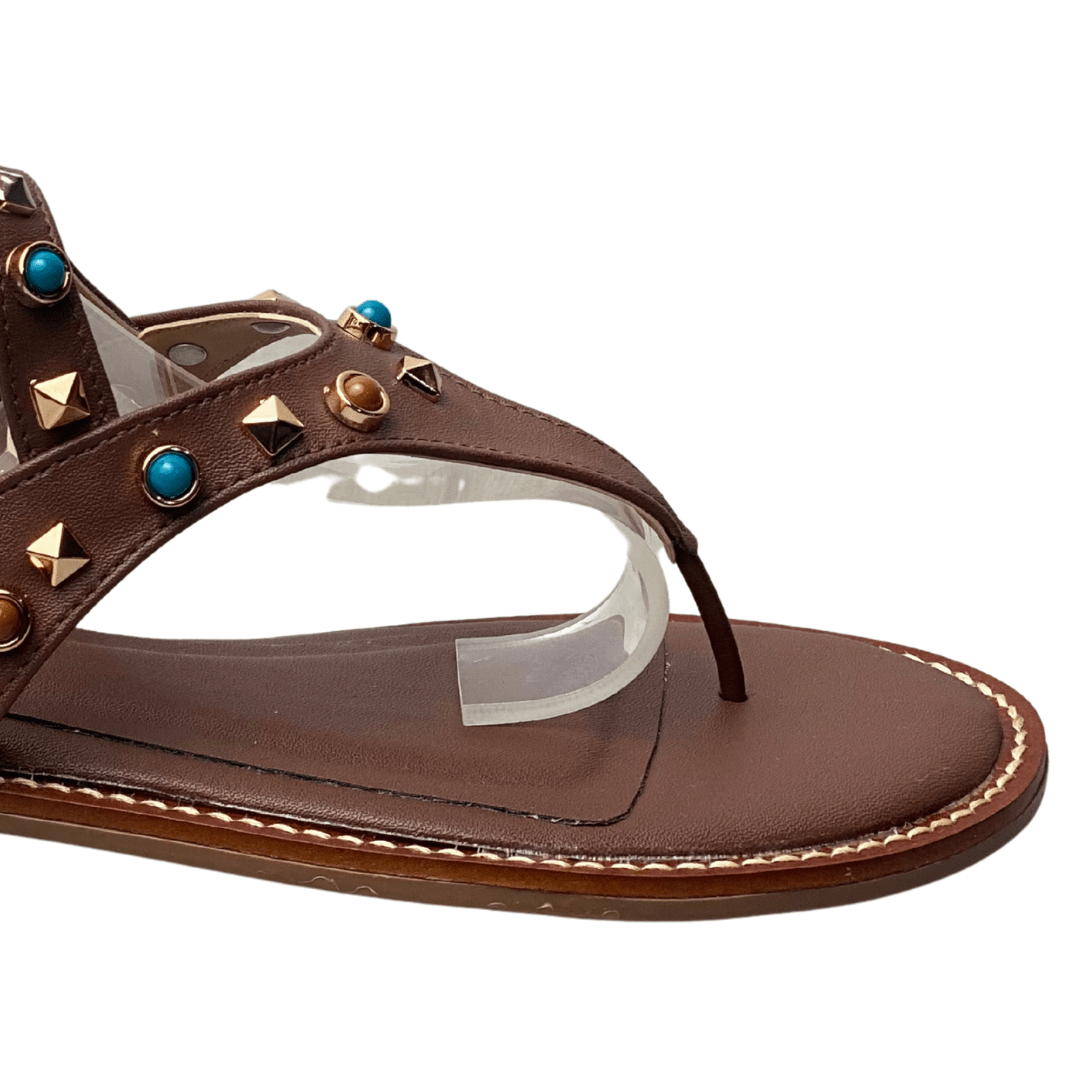 O design elegante com pedrarias coloridas e tachas metálicas adiciona um toque sofisticado e diferenciado ao look.