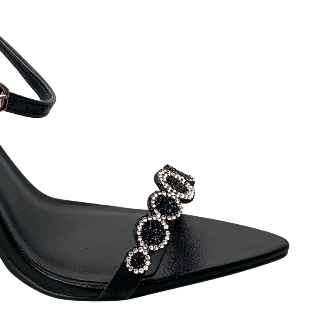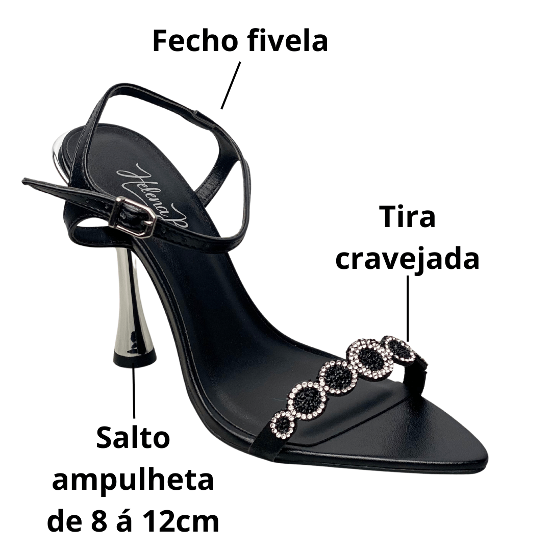 Ponto de Luz no Look: A tira frontal apresenta ornamentos circulares inteiramente cravejados com cristais, garantindo um brilho sofisticado a cada passo.