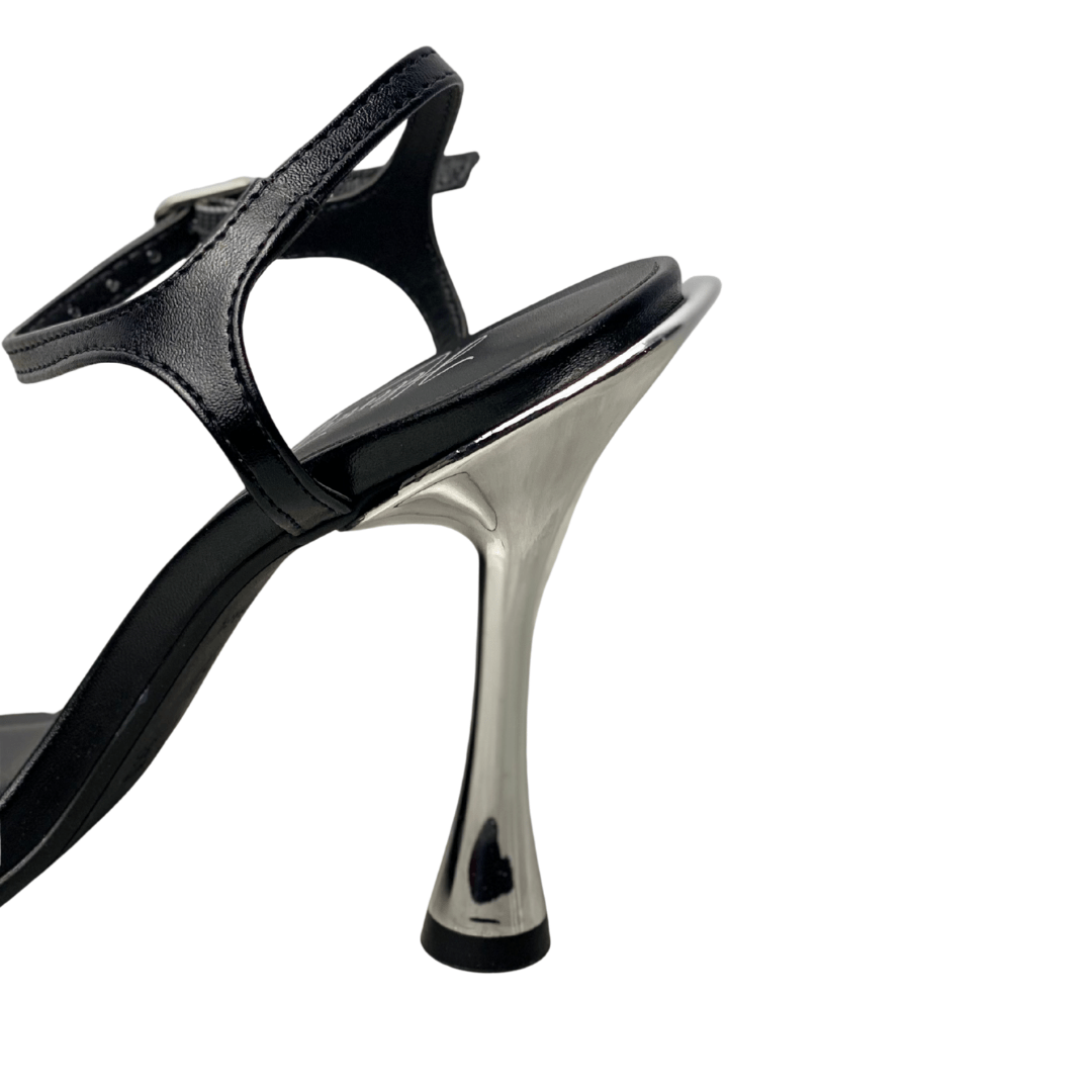 Design de Impacto: O salto fino com acabamento metálico prata cria um contraste moderno e luxuoso com o cabedal preto.