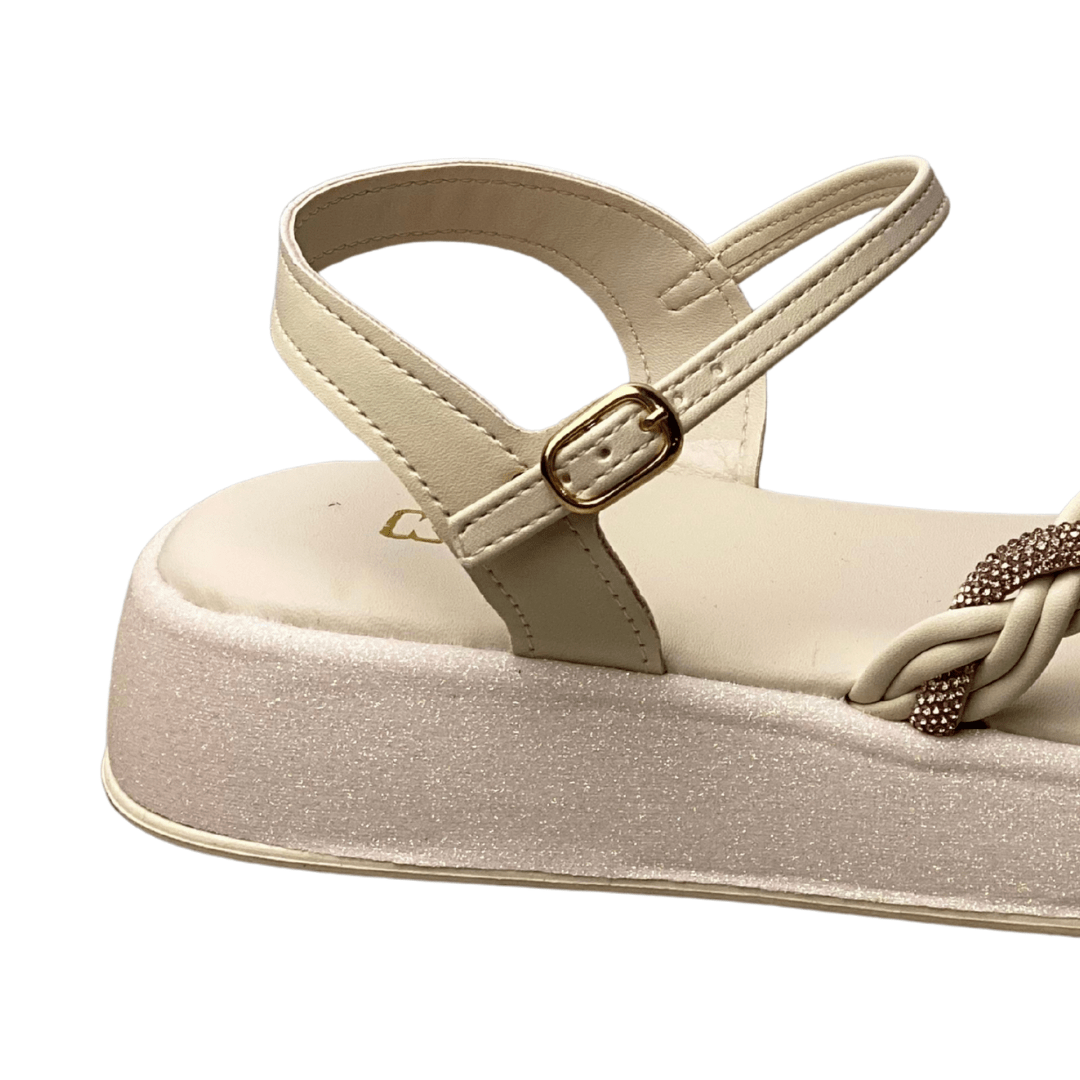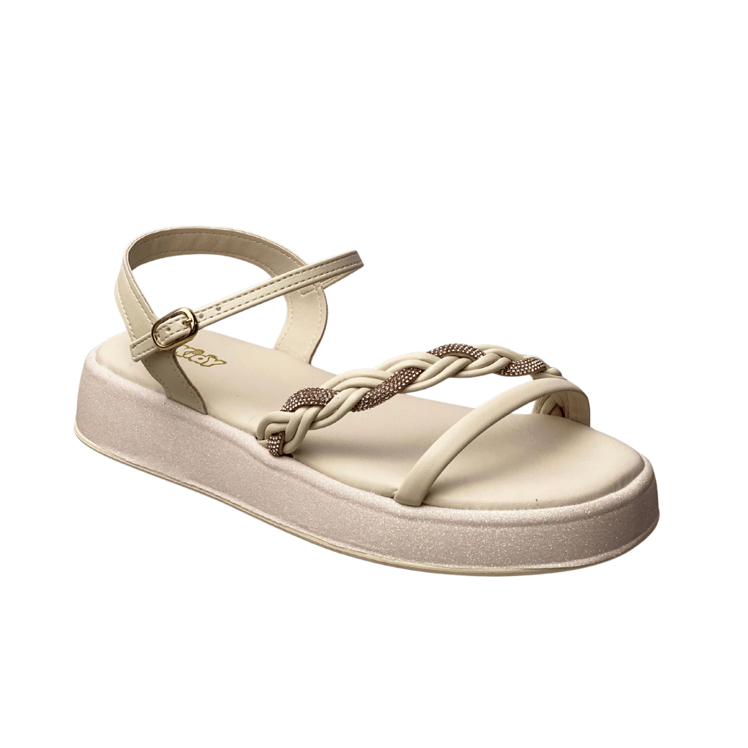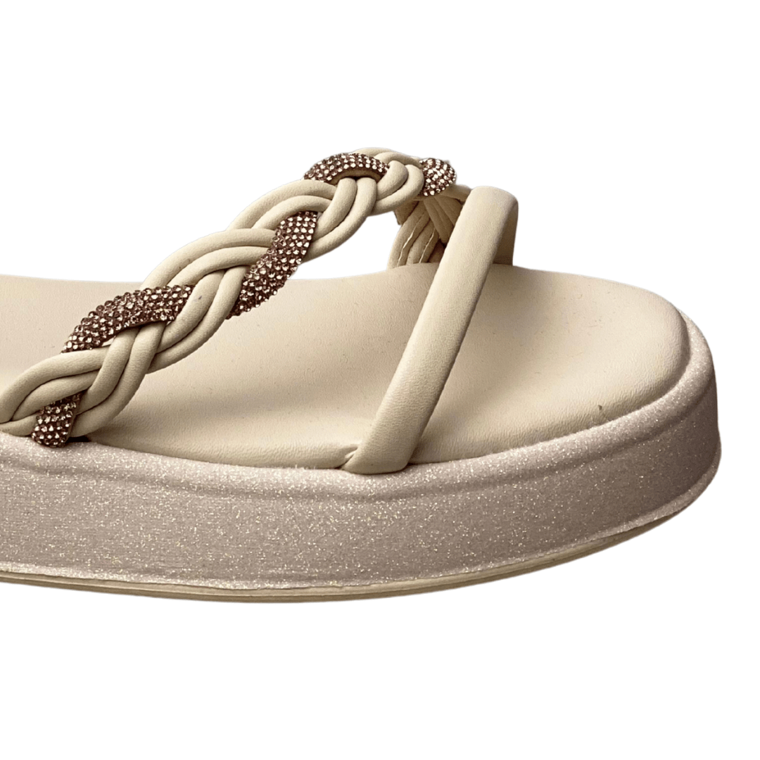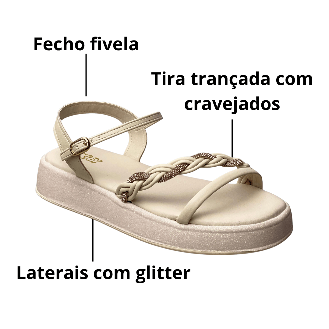 Design: Tira frontal trançada com glitter e fechamento com fivela ajustável.