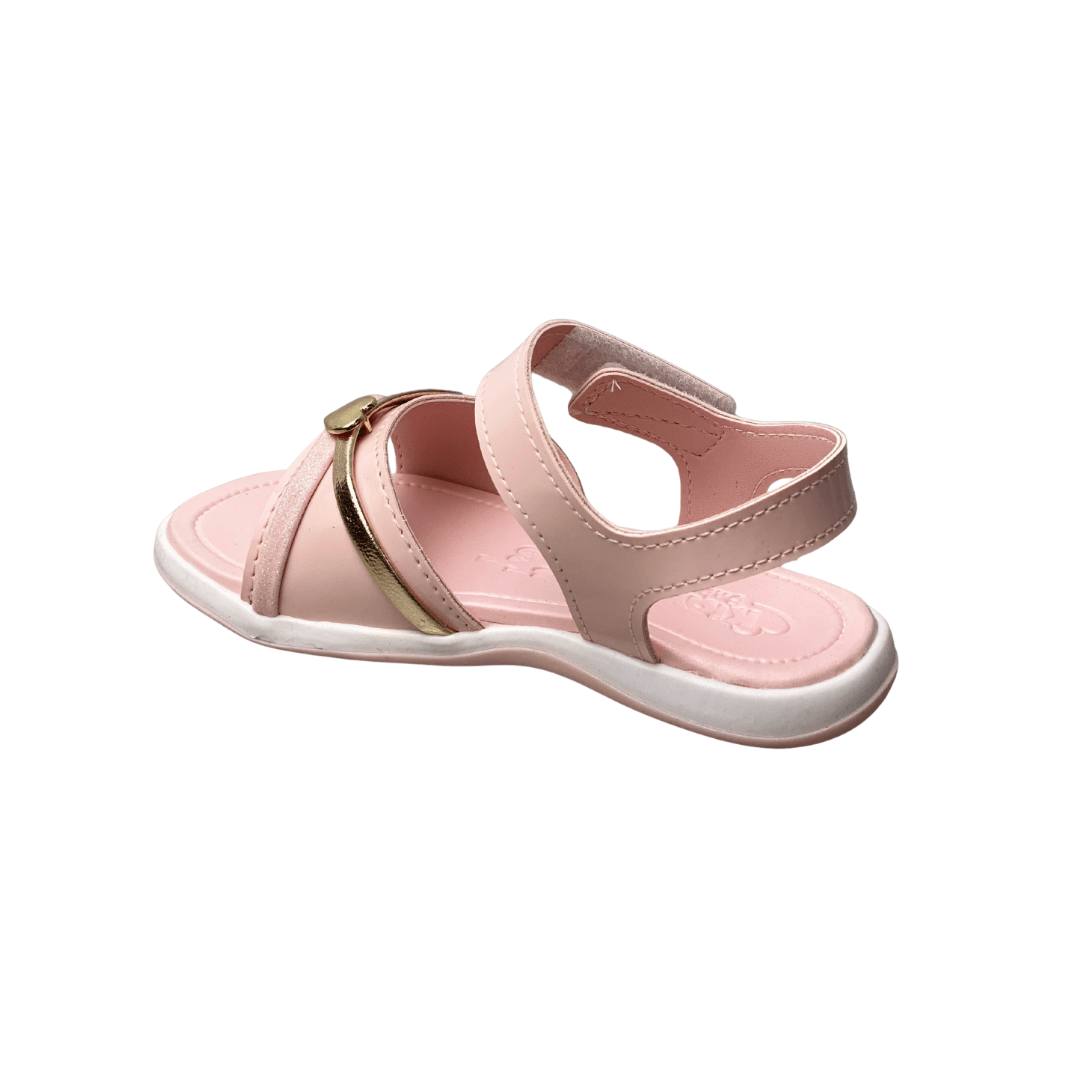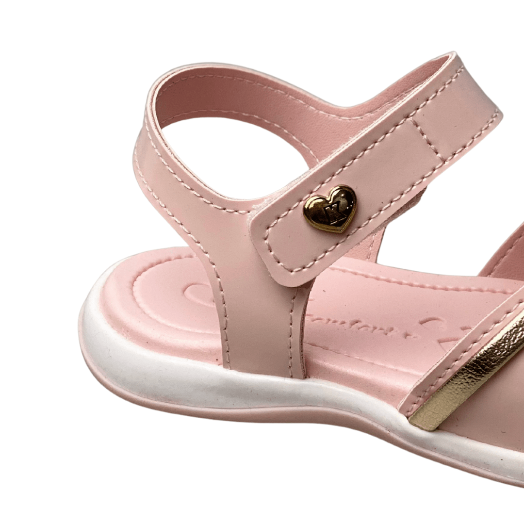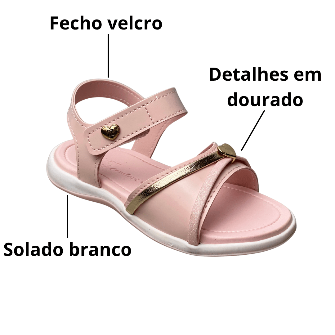 Beleza e estilo: O design delicado em nude com tiras douradas e aplique de coração dá um toque elegante e moderno ao look infantil.