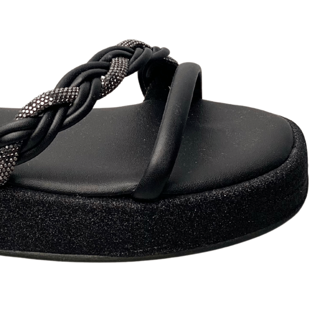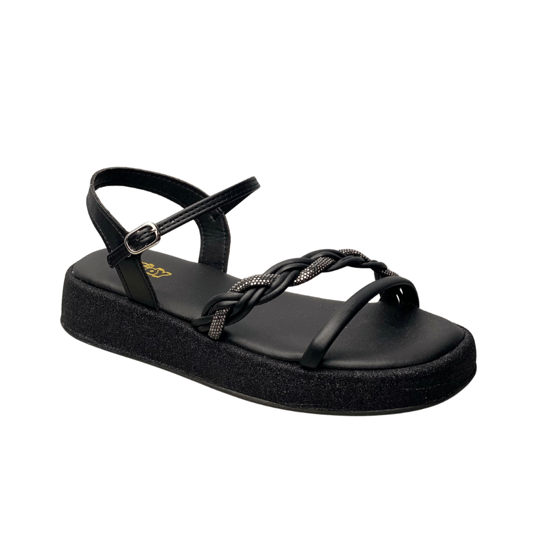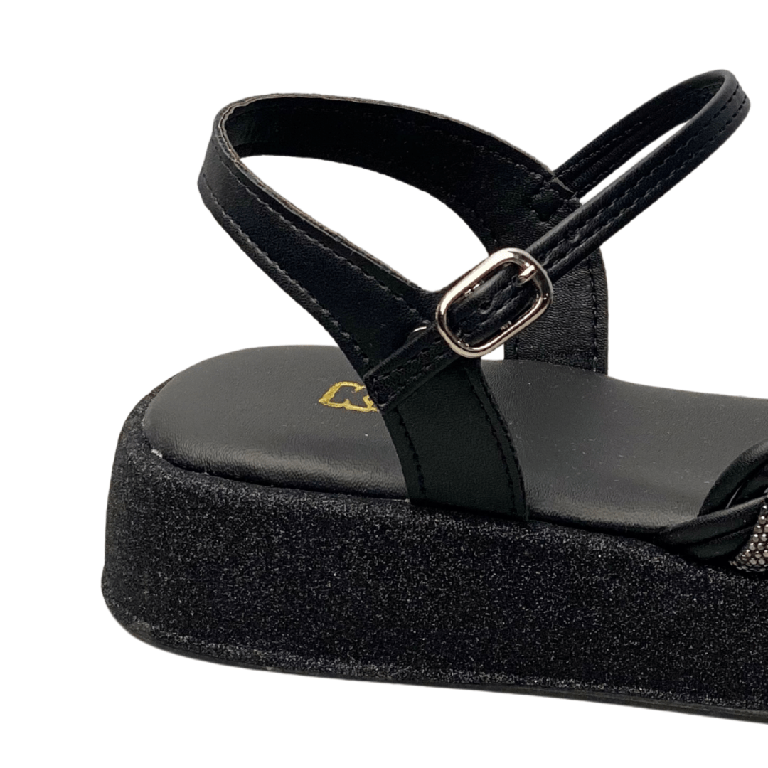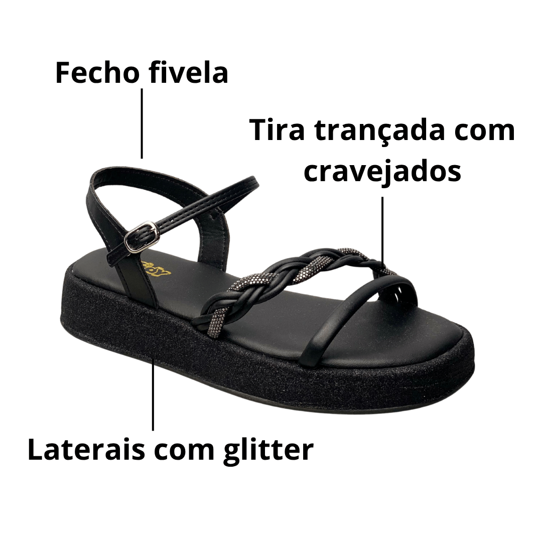 Design: Tira frontal trançada com glitter e fechamento com fivela ajustável.
