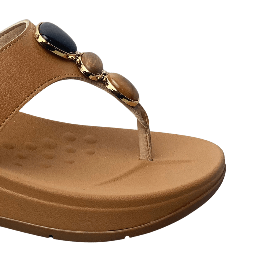 Detalhes: Tira frontal em "T" com aplicação de três pedras decorativas e acabamento dourado.