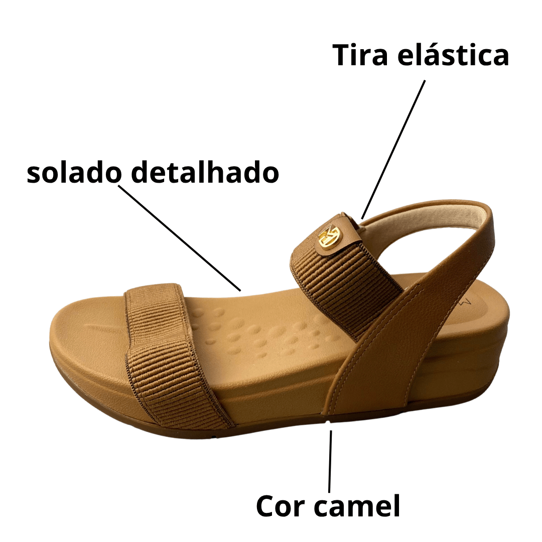 Design: Modelo com tiras largas que envolvem o pé de forma firme e confortável, com detalhe em elástico que facilita o calce.