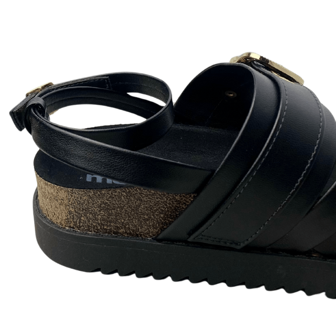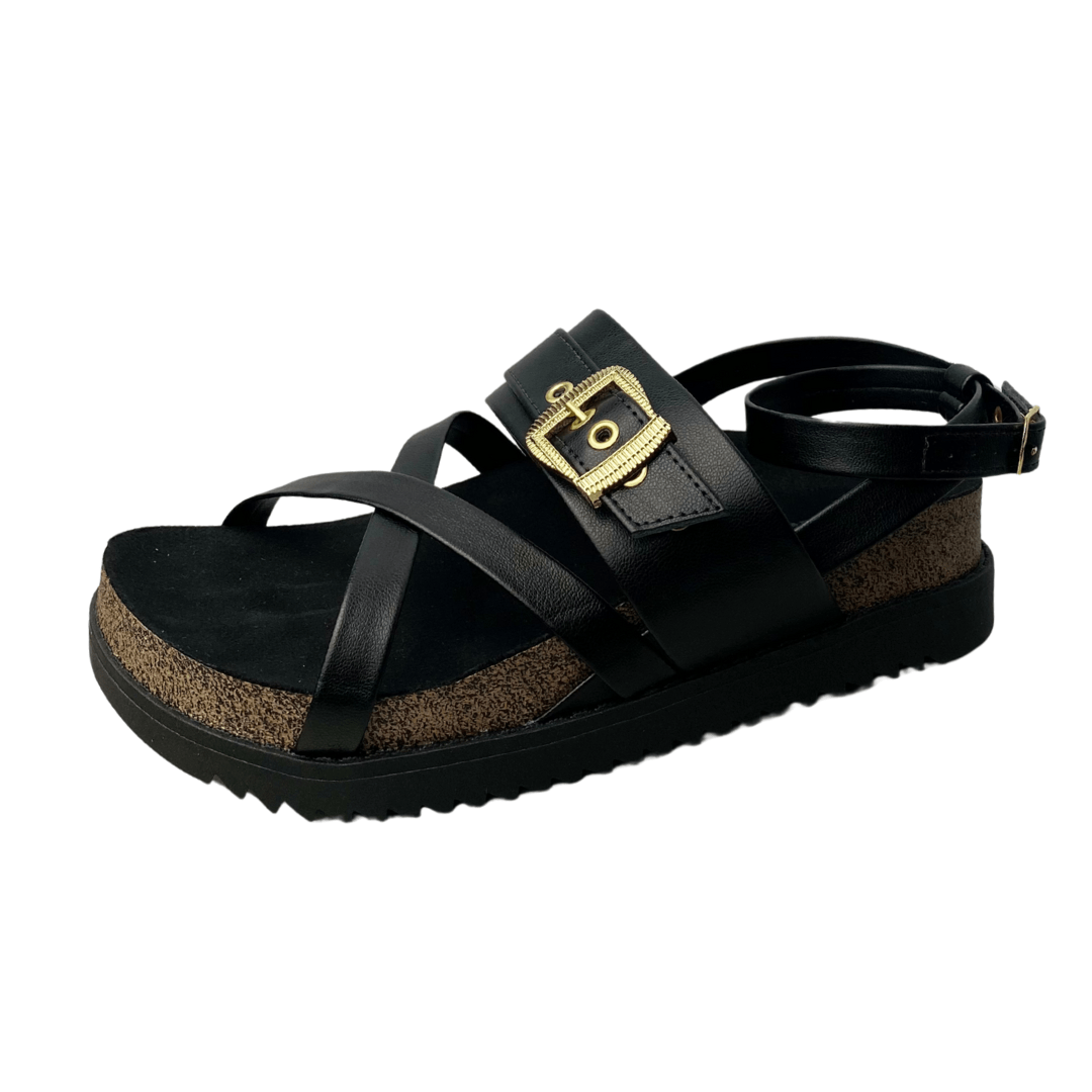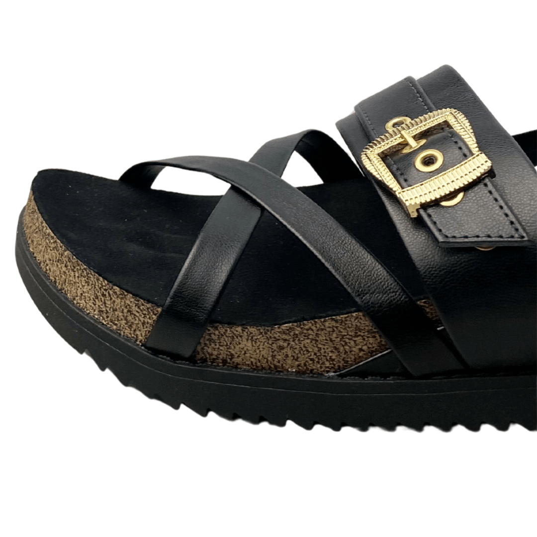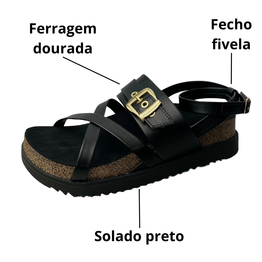 Design moderno com detalhe em fivela dourada que valoriza o visual.