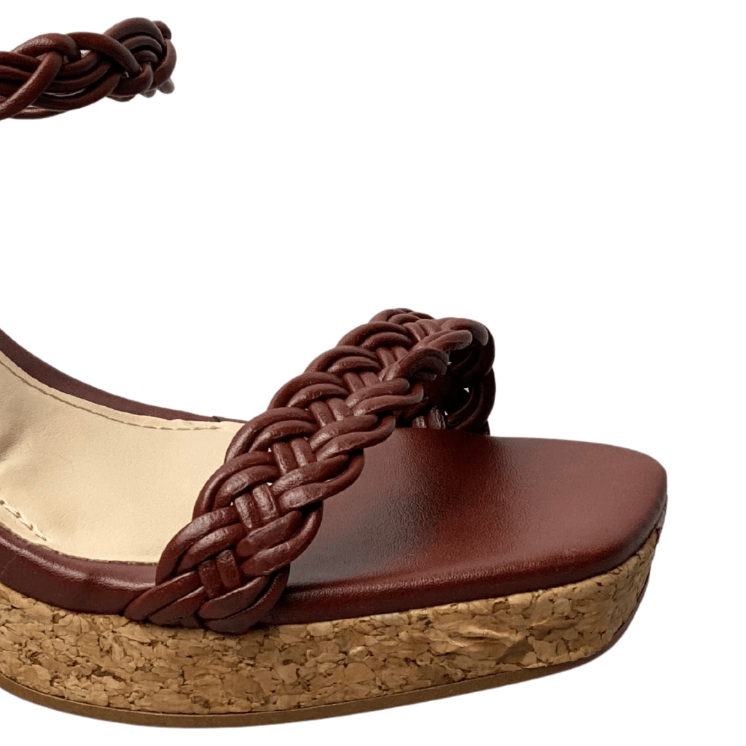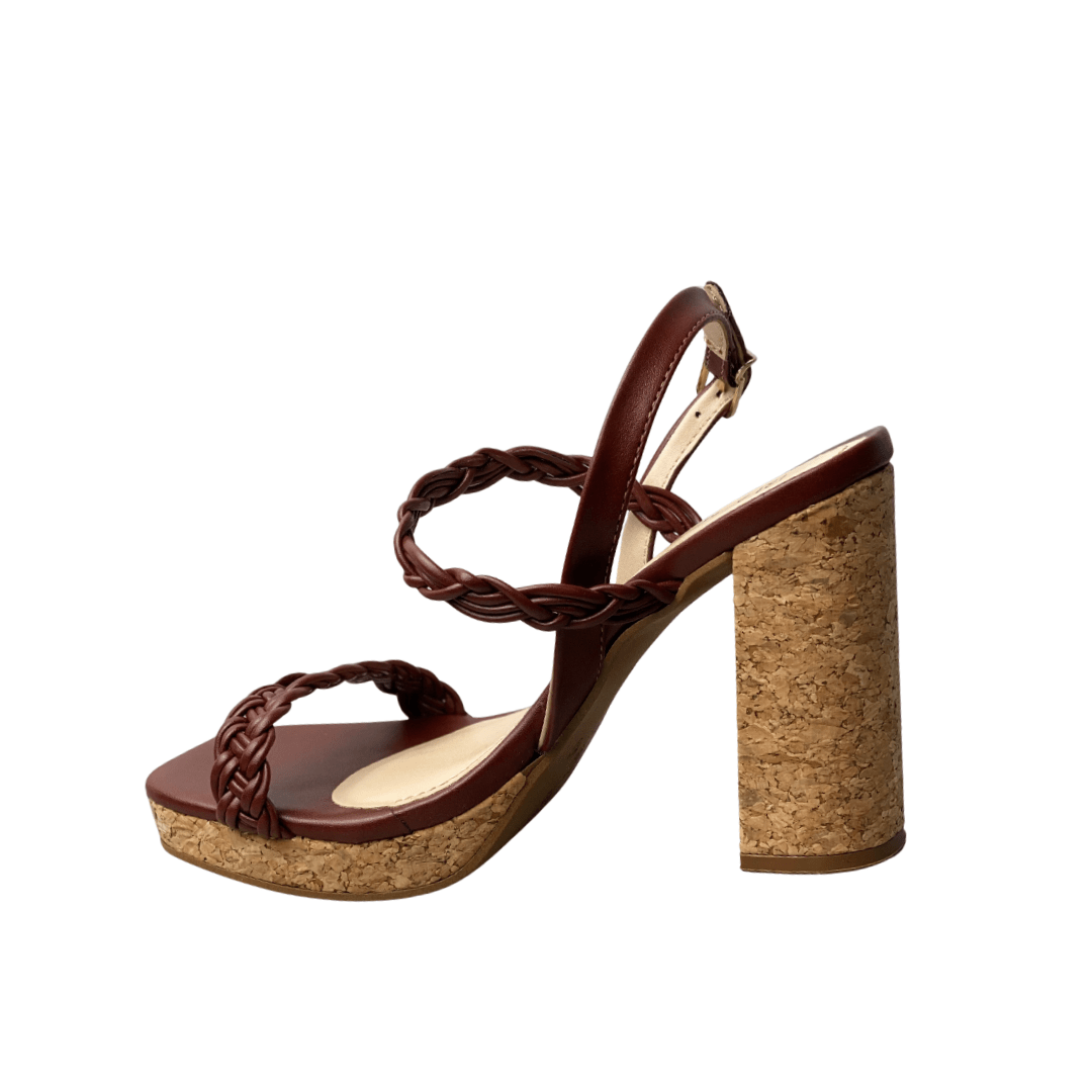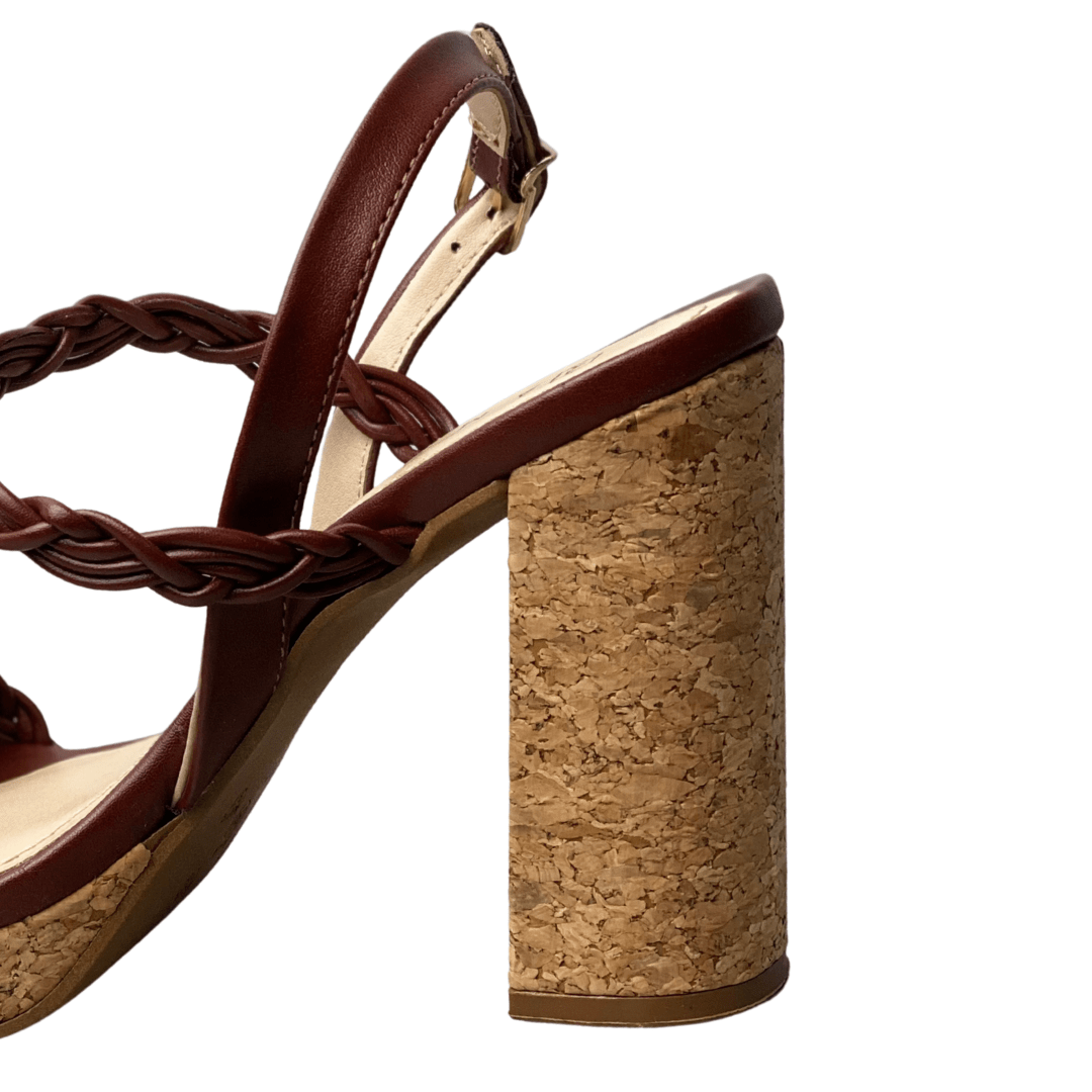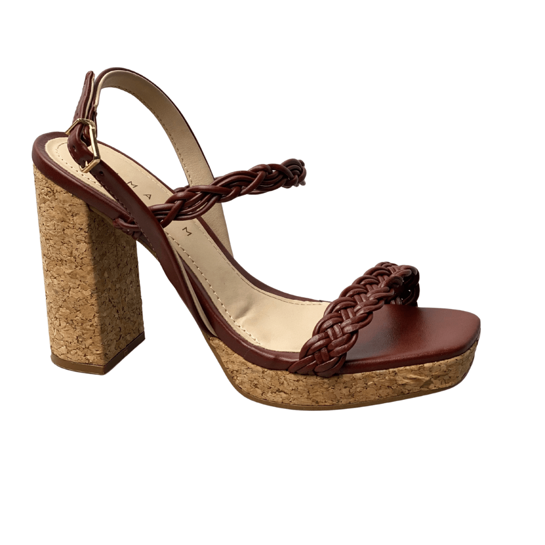 O salto bloco em cortiça proporciona estabilidade e um toque natural, perfeito para o verão.