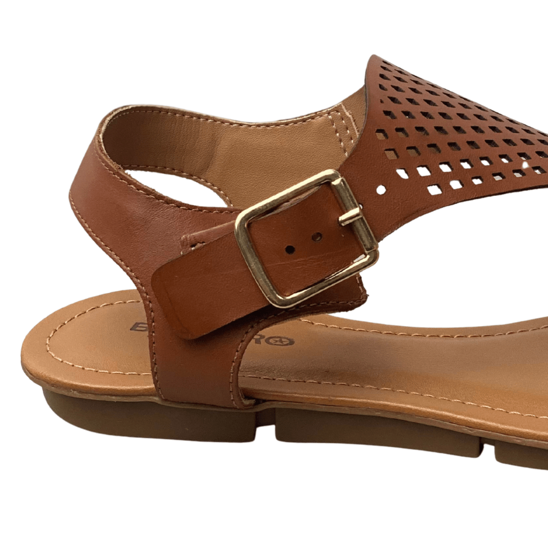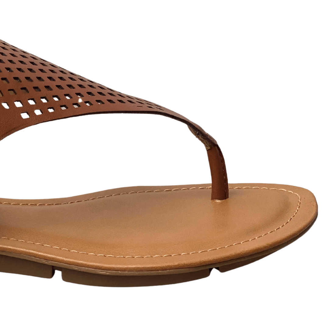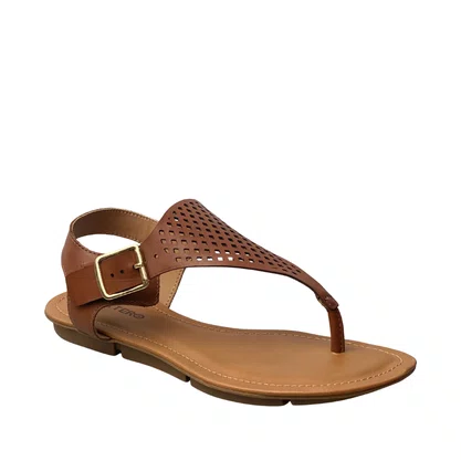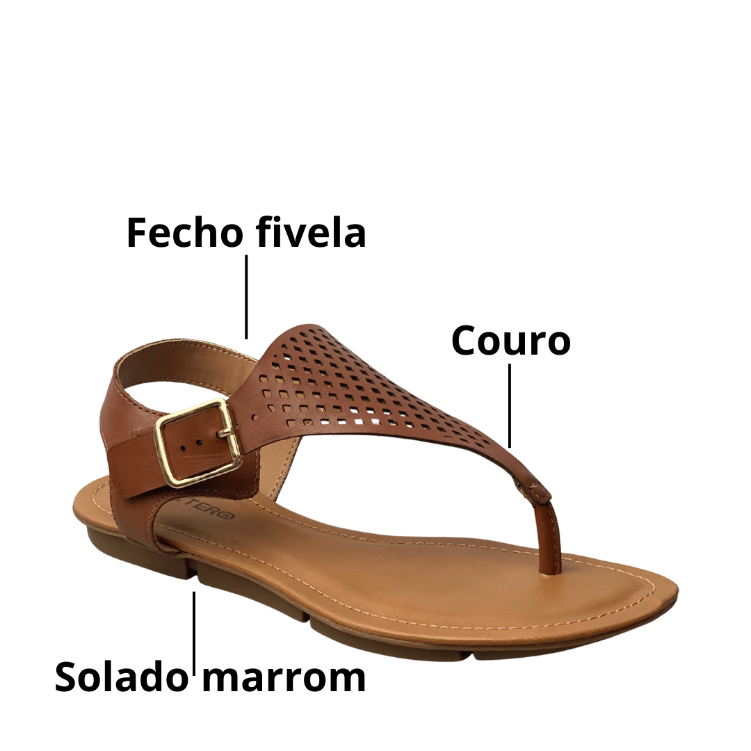Toque de Elegância: O design em couro conhaque com detalhes vazados (micro furos) adiciona uma sofisticação discreta a qualquer look de verão.