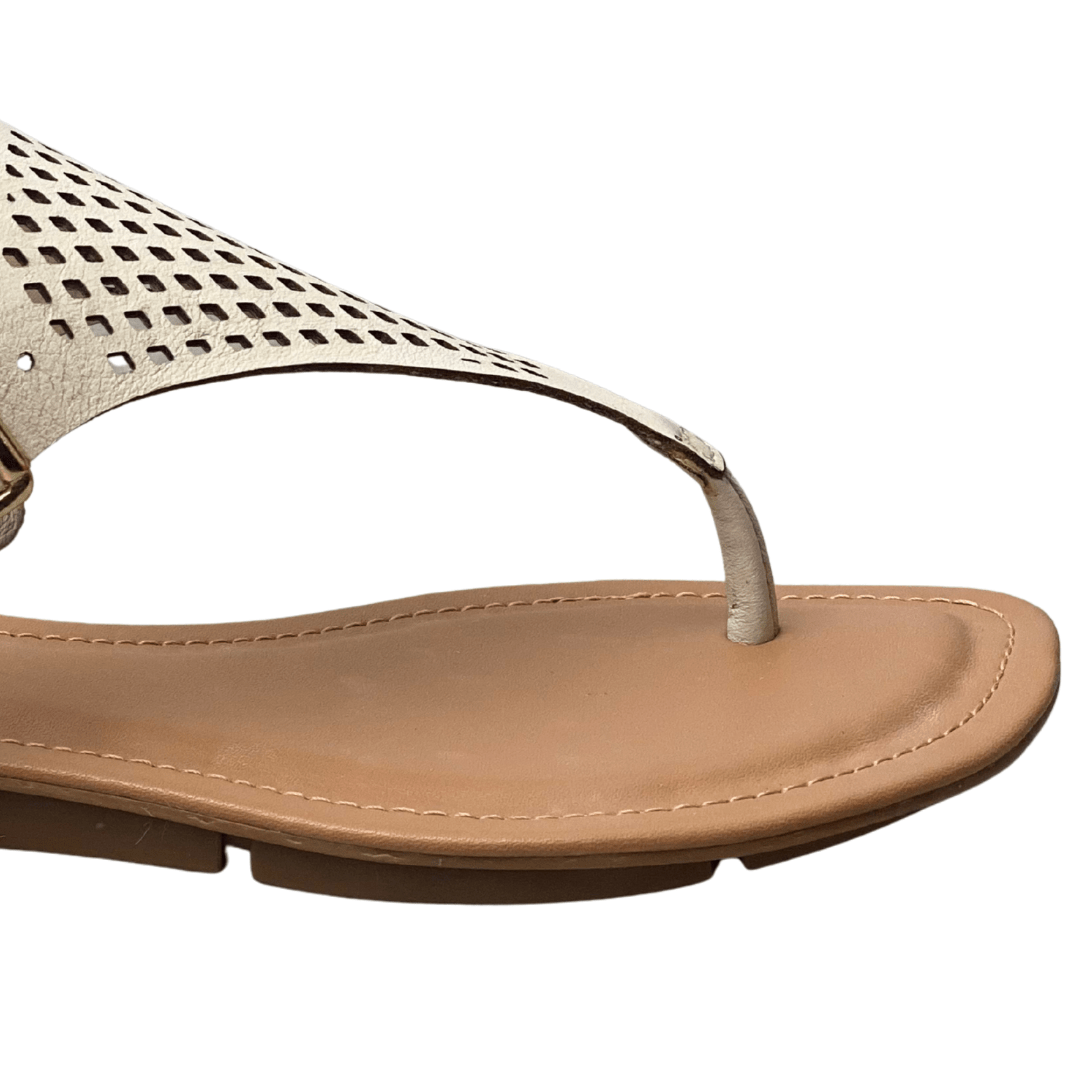 Toque de Elegância: O design em couro off-white com detalhes vazados (micro furos) adiciona uma sofisticação discreta a qualquer look de verão.