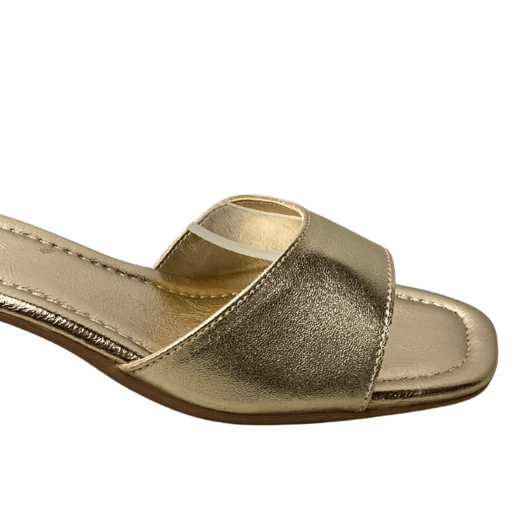 Fechamento: Tira fina com Fivela Ajustável no tornozelo, na cor dourada.