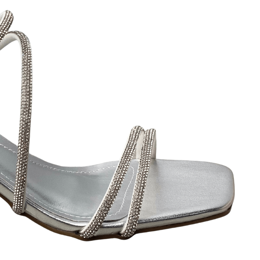 Brilho Sutil e Moderno: As múltiplas tiras frontais cruzadas, adornadas com strass, proporcionam um efeito de brilho elegante sem exageros.