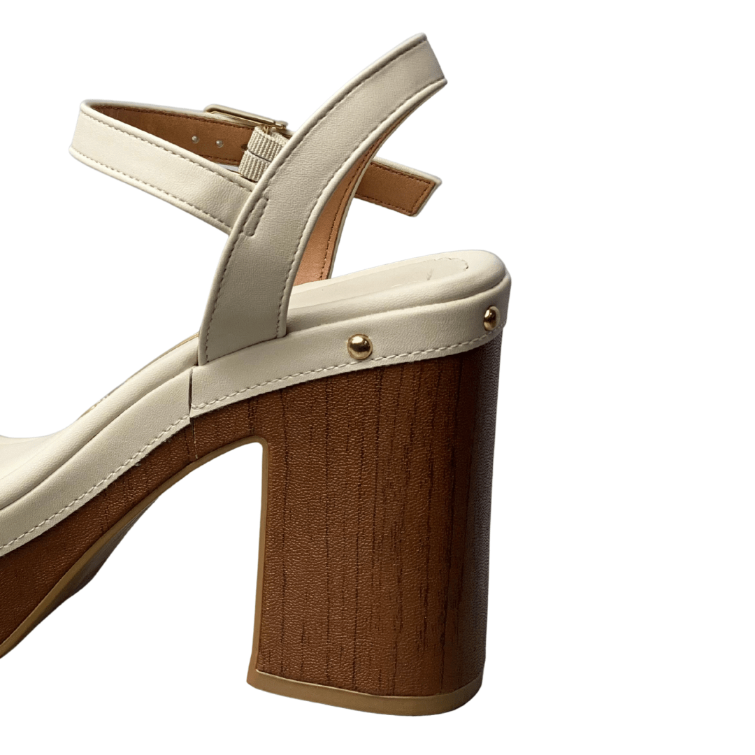 Detalhes: Ferragens douradas nas laterais e acabamento em madeira no salto