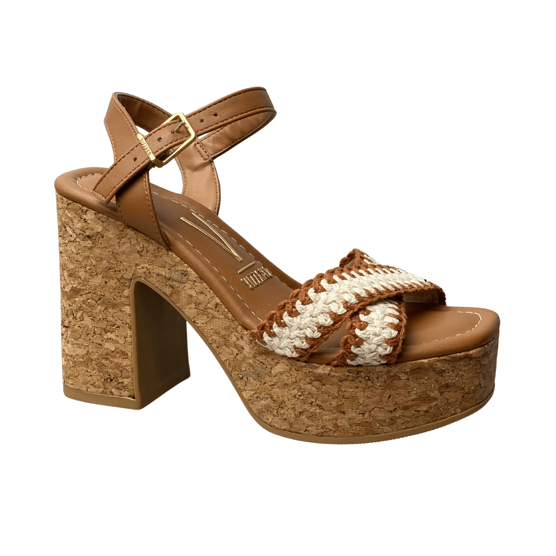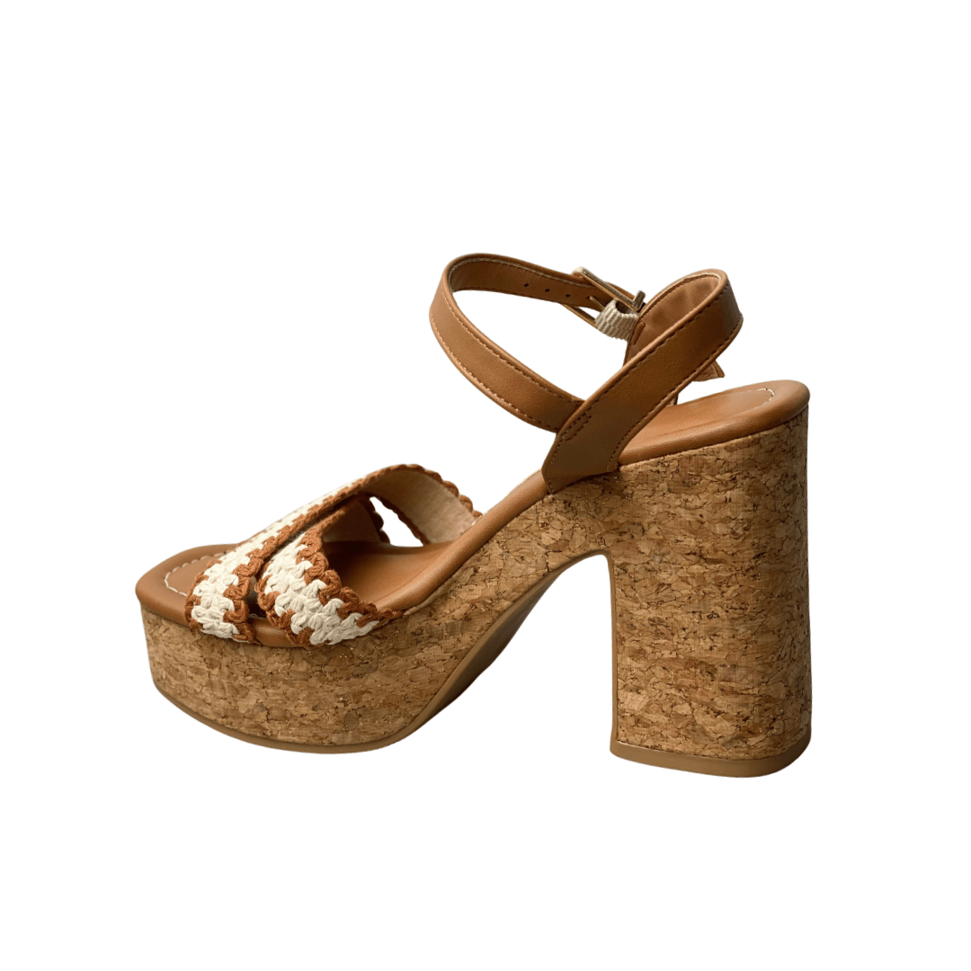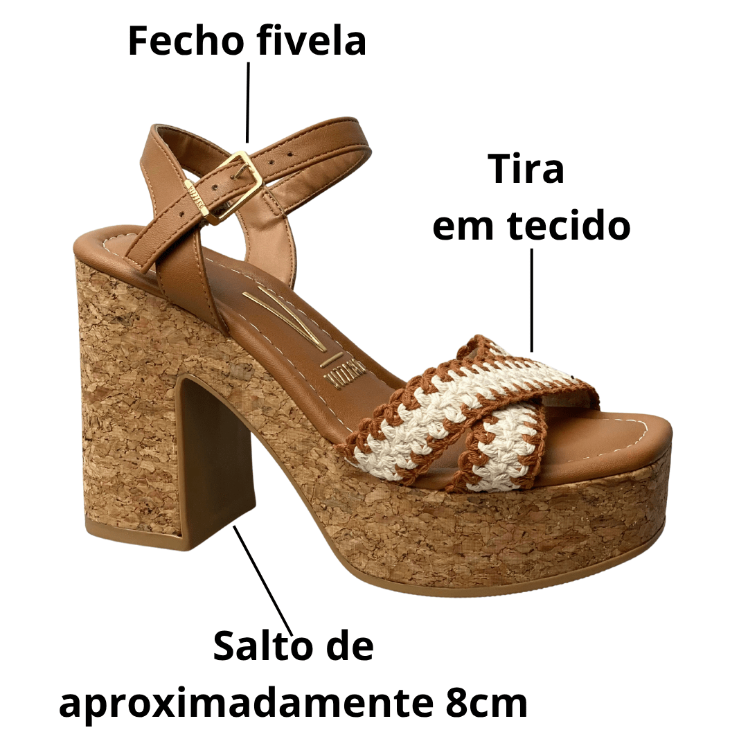Detalhes: Trama trançada e acabamento em cortiça no salto e plataforma