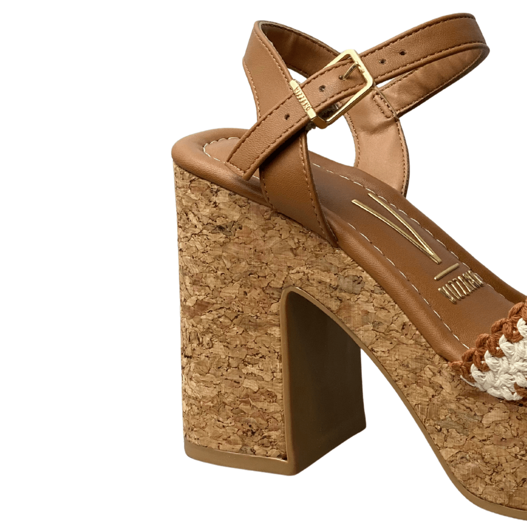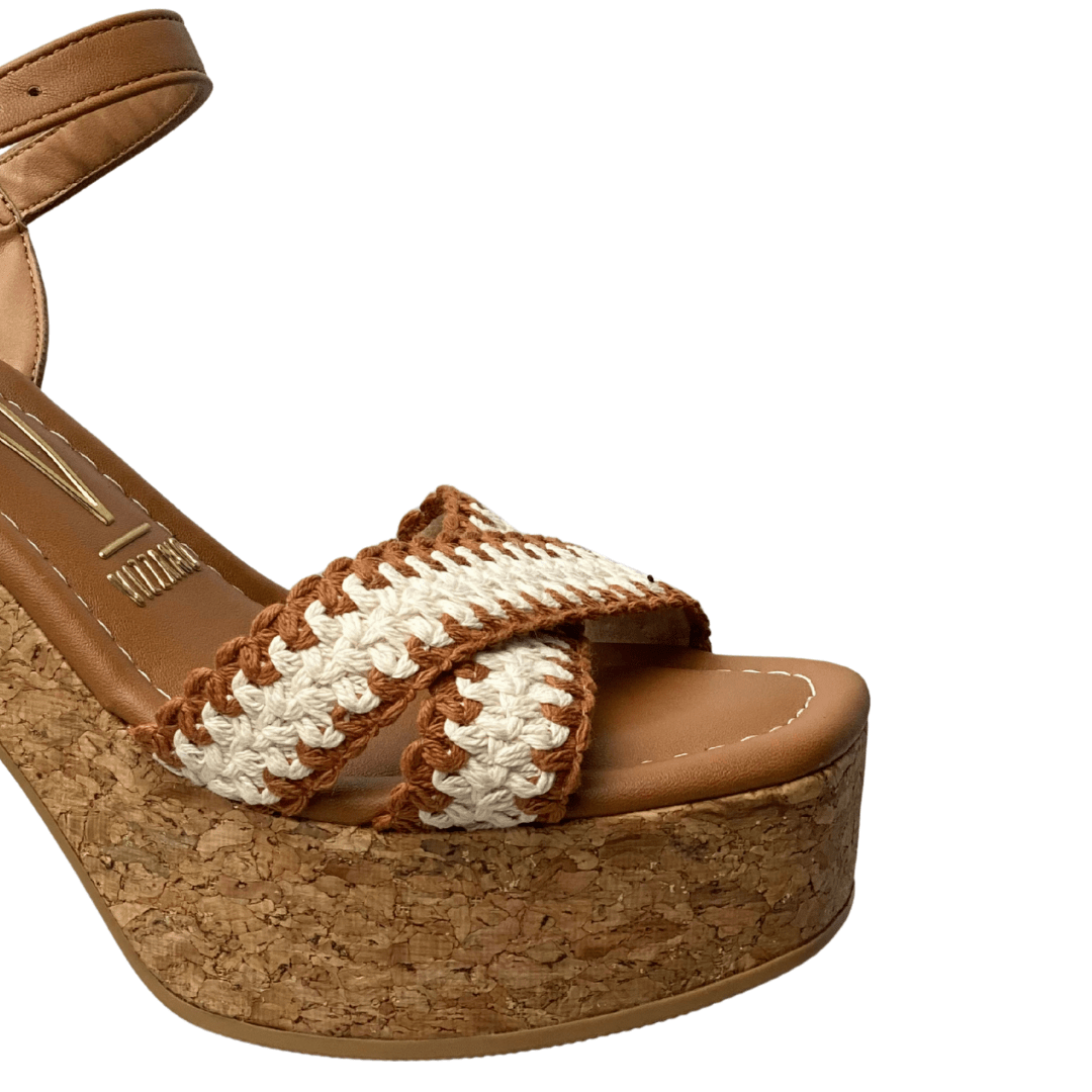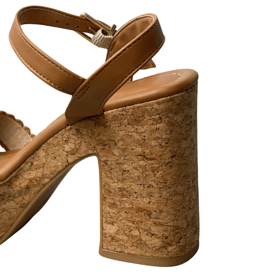 Detalhes: Trama trançada e acabamento em cortiça no salto e plataforma