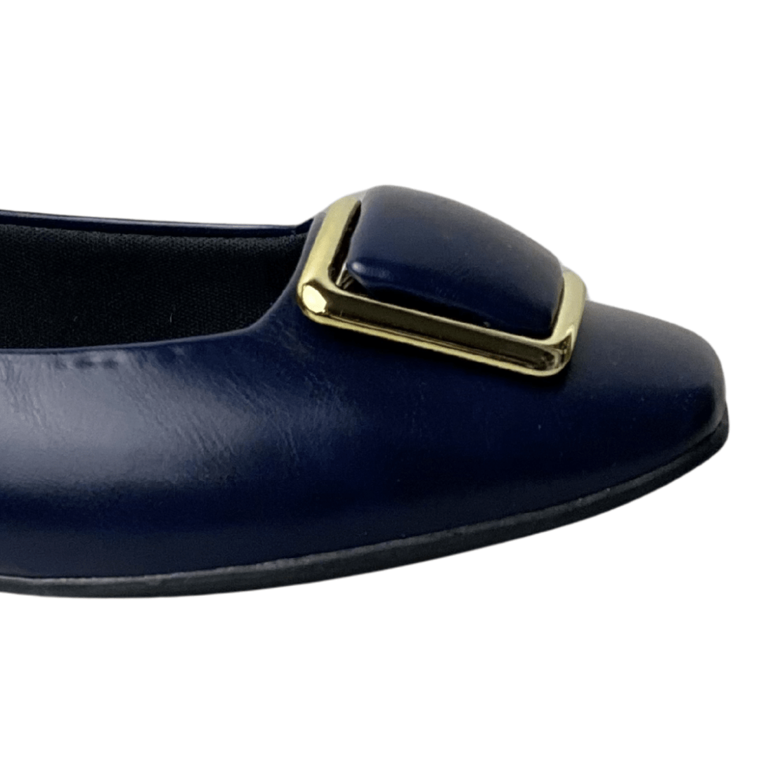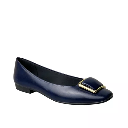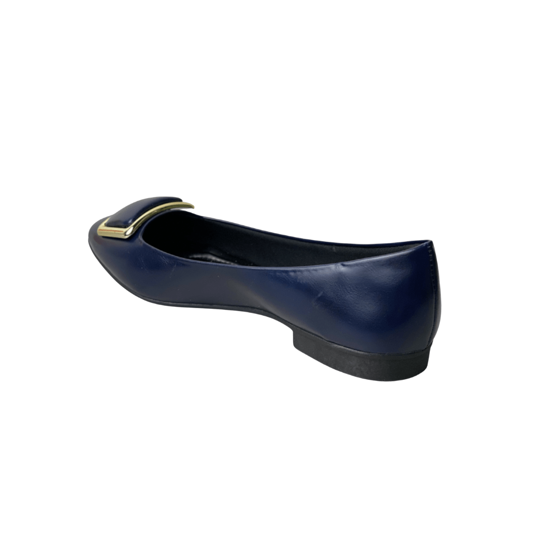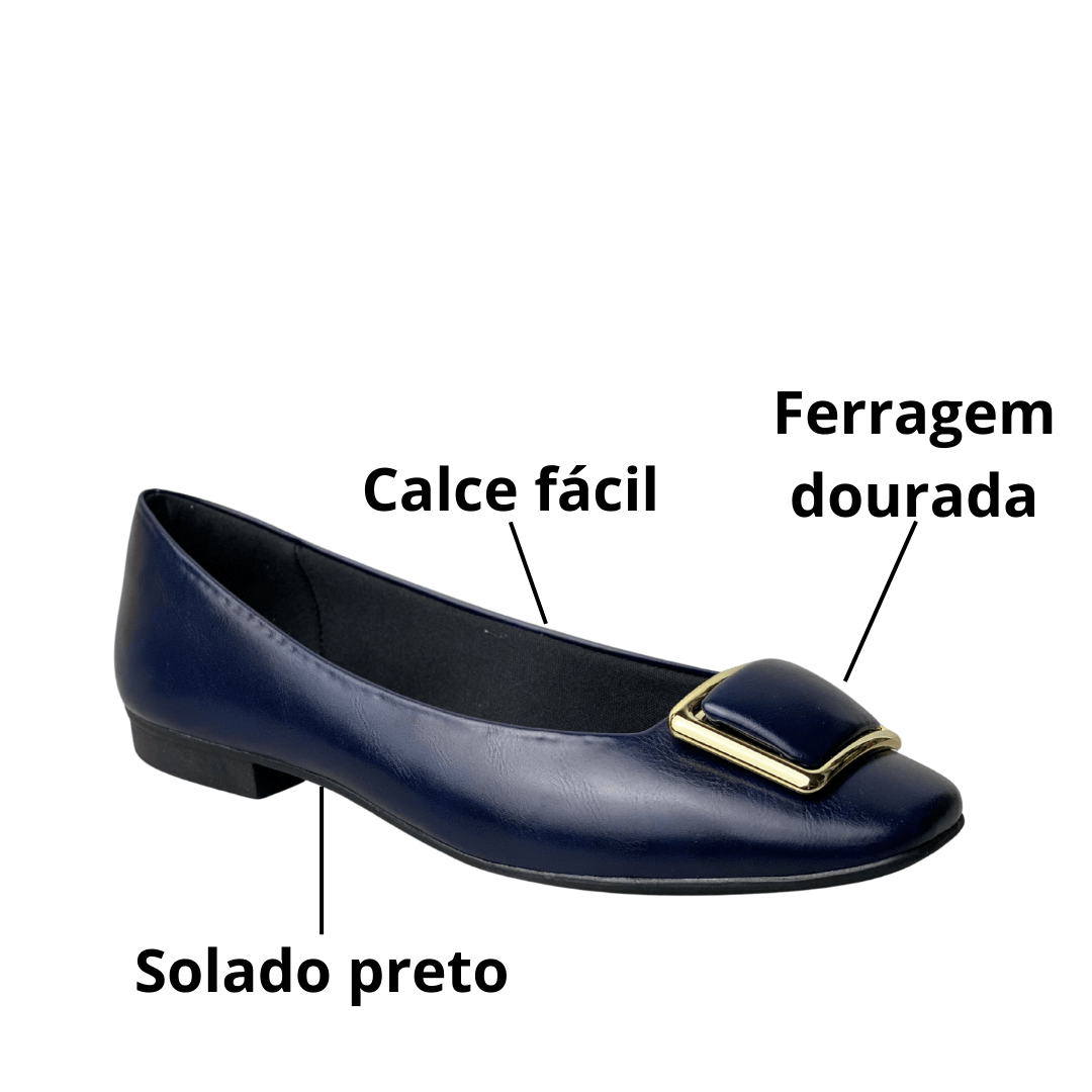 Detalhe Frontal: Exclusiva ferragem dourada retangular aplicada sobre o cabedal, que atua como ponto de luz no calçado.