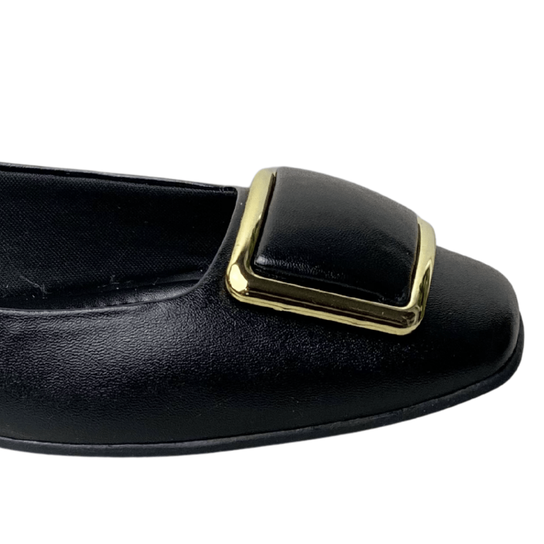 Detalhe Frontal: Ferragem dourada imponente com design retangular e cantos arredondados, aplicada sobre o cabedal.