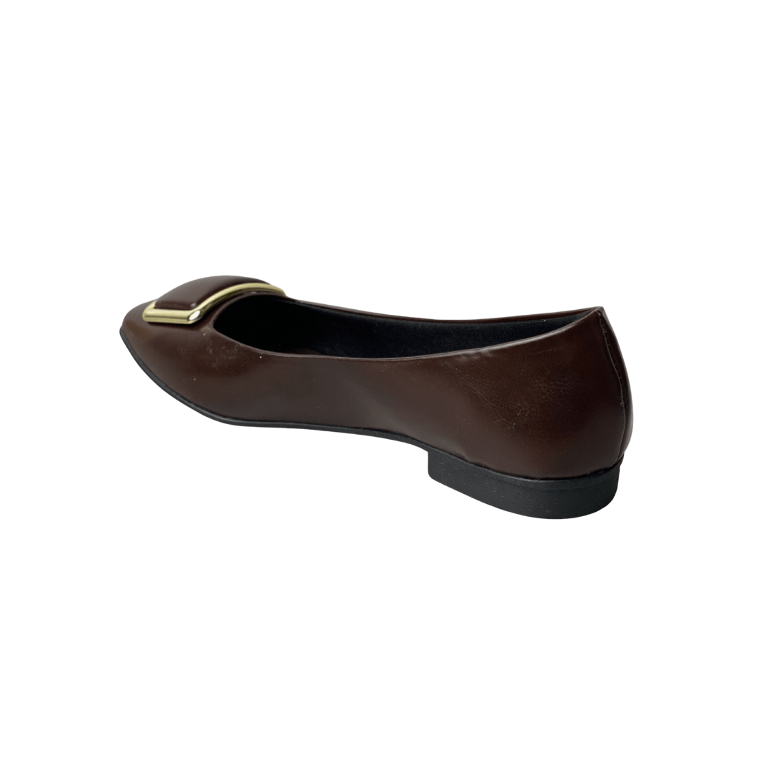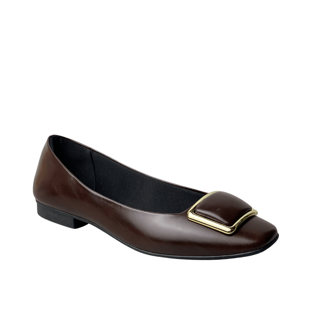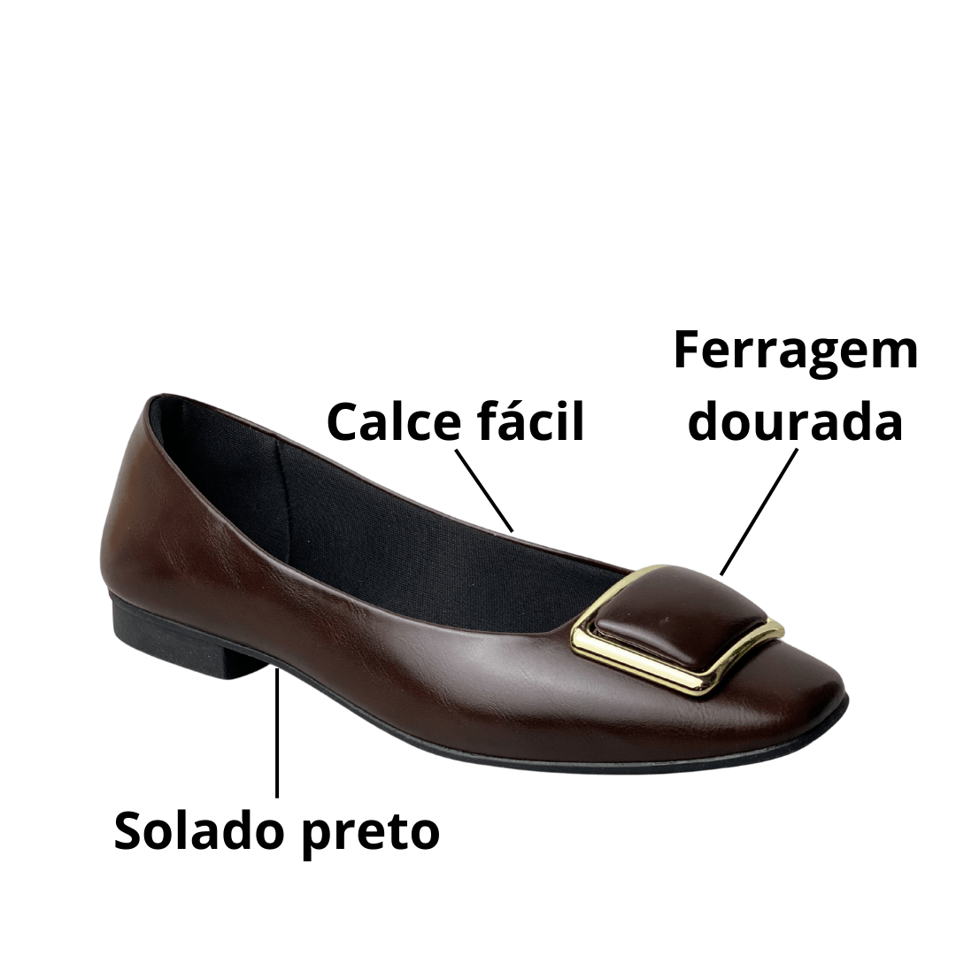 Elegância Instantânea: O bico quadrado aliado à ferragem dourada confere um ar sofisticado e moderno ao visual.