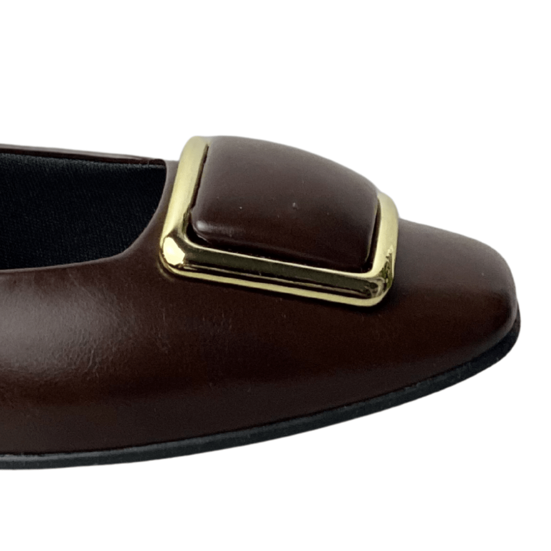Detalhe de Destaque: Aplicação de ferragem dourada imponente sobre o cabedal, garantindo um toque de luxo.
