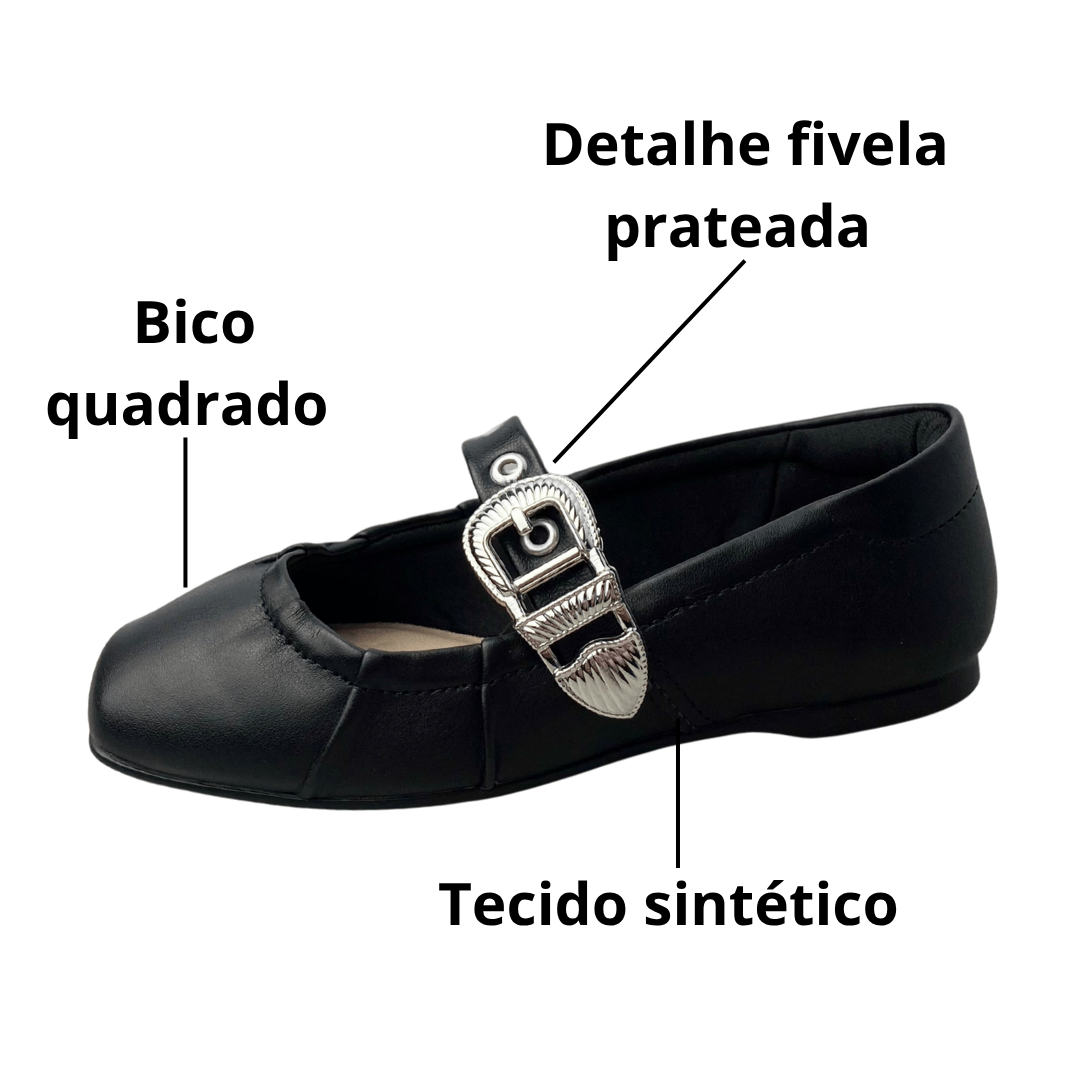 Detalhe: Fivela prateada decorativa, que traz charme extra ao calçado.
