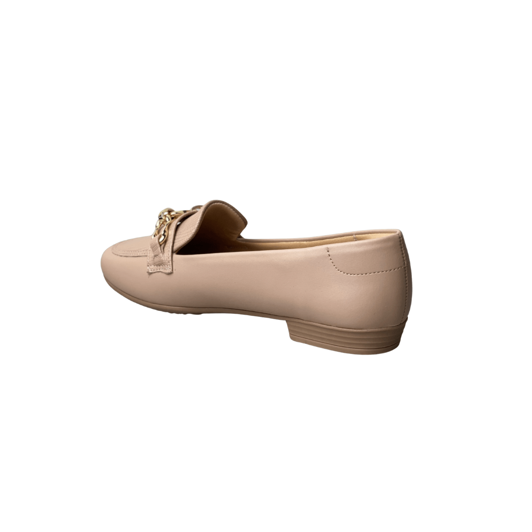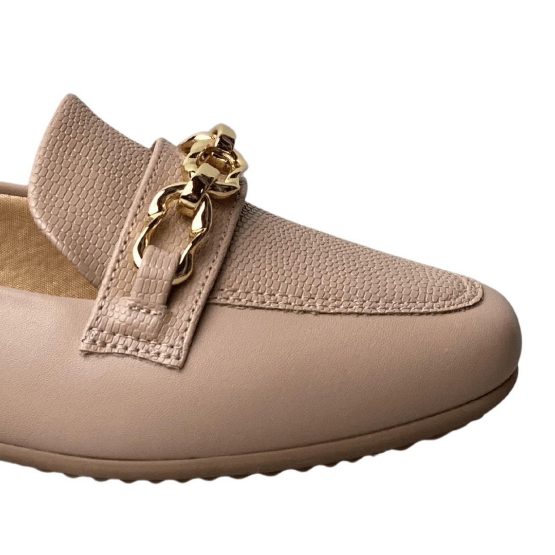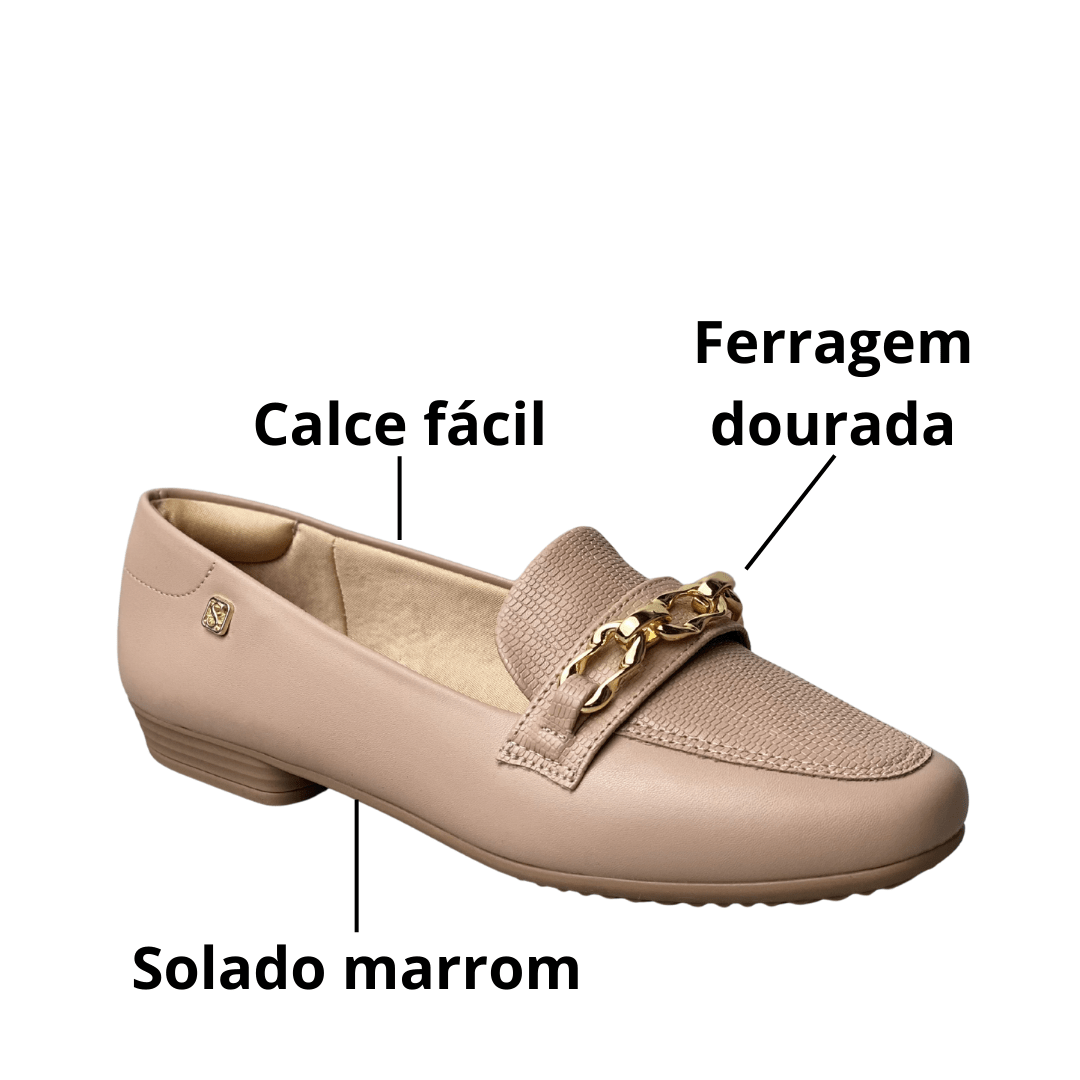 Detalhe de Destaque: Exclusiva ferragem em corrente dourada sobre o cabedal, conferindo um ar "premium" ao calçado.