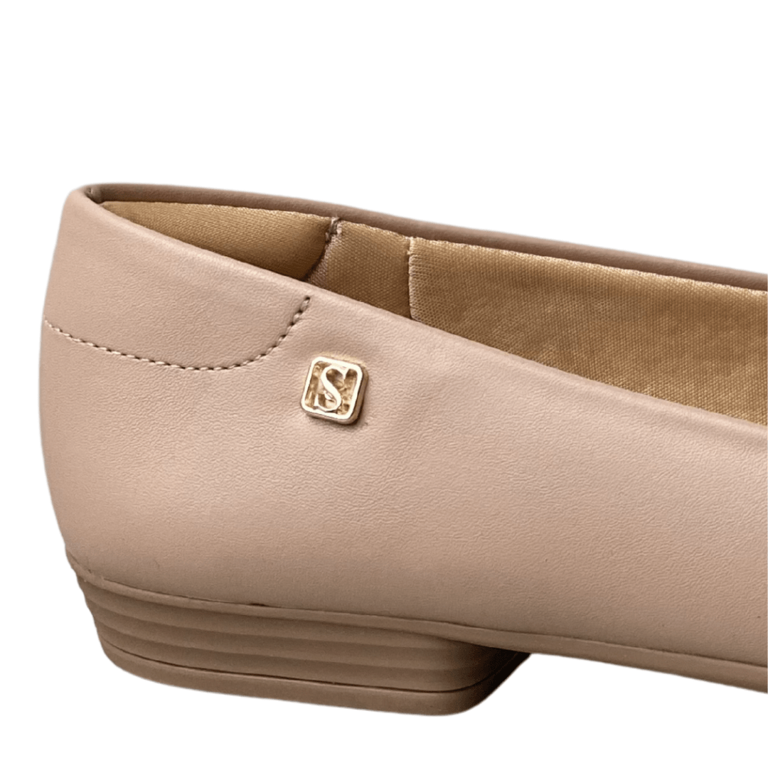 Solado: Emborrachado e antiderrapante em tom natural, garantindo passos silenciosos e seguros.