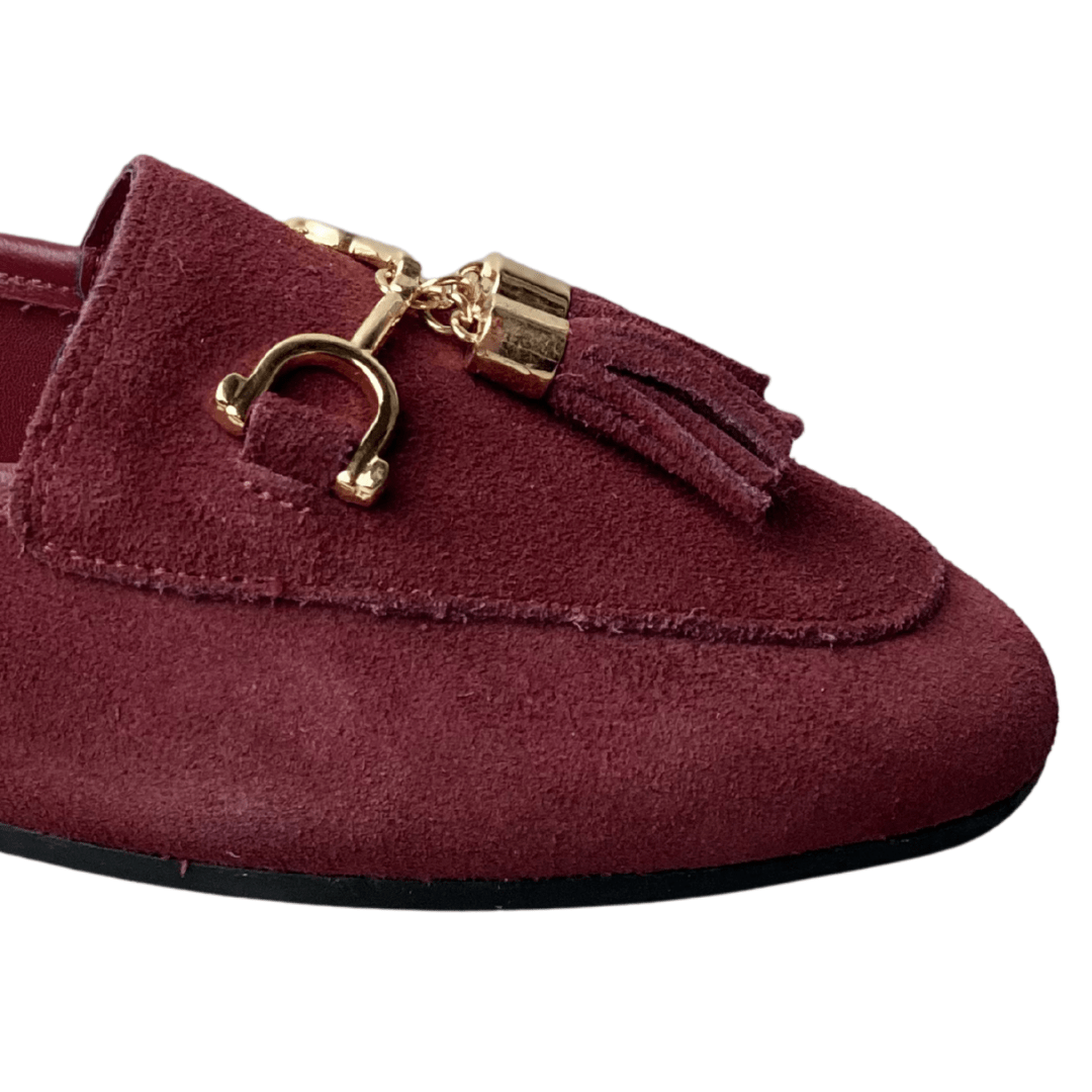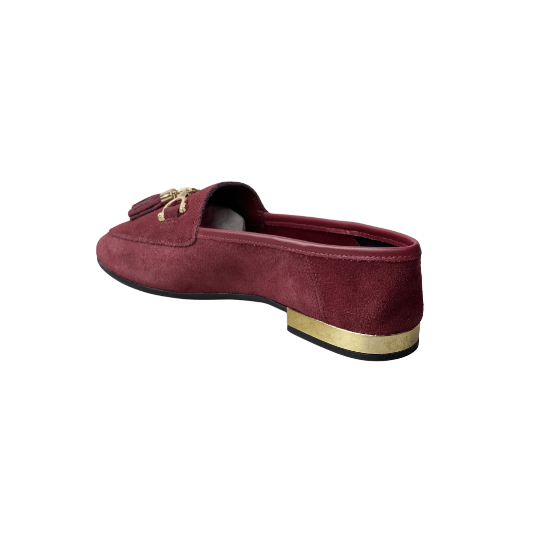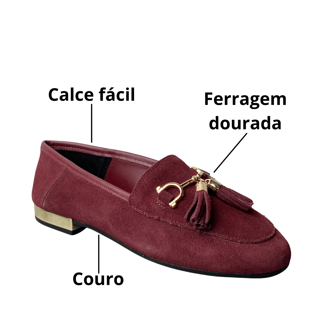 A Sapatilha Santinelli na cor Cabernet (Vinho) exala sofisticação. Seu design tipo mocassim é enriquecido por um adorno metálico dourado e um tassel clássico, resultando em um visual "confortável, estiloso e lindo".