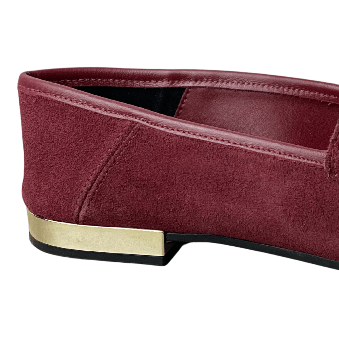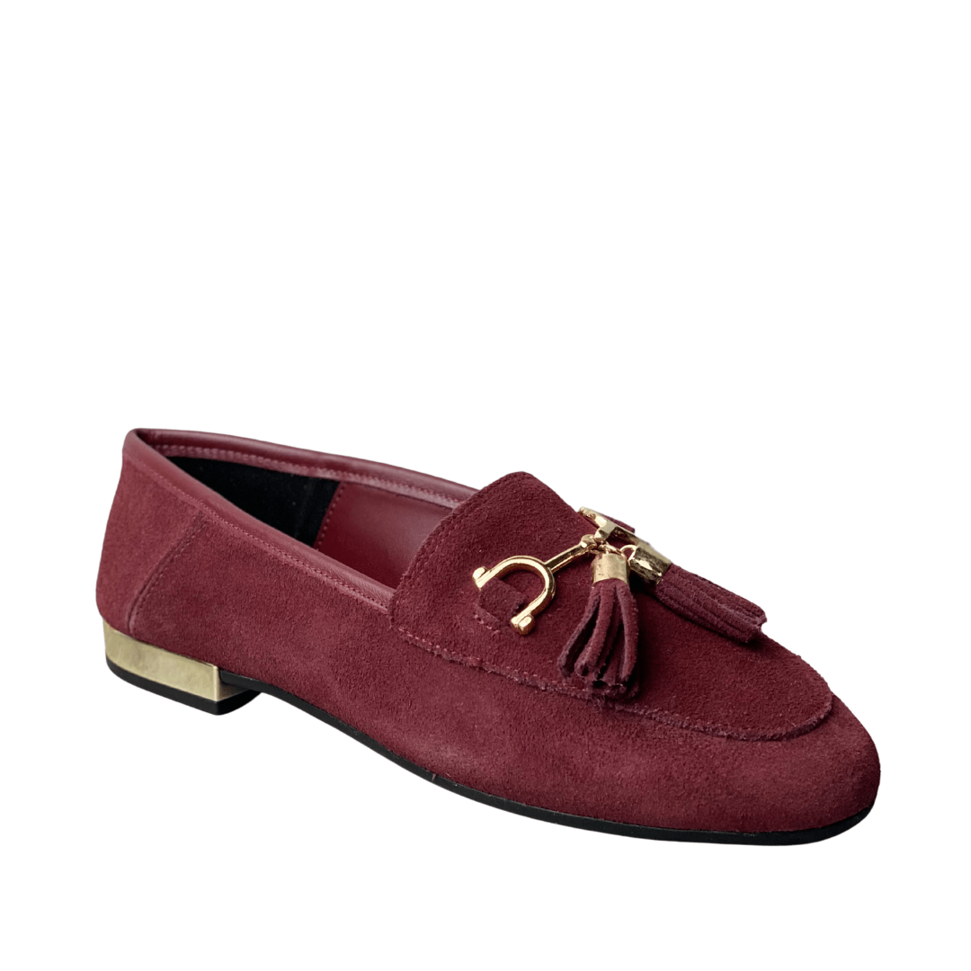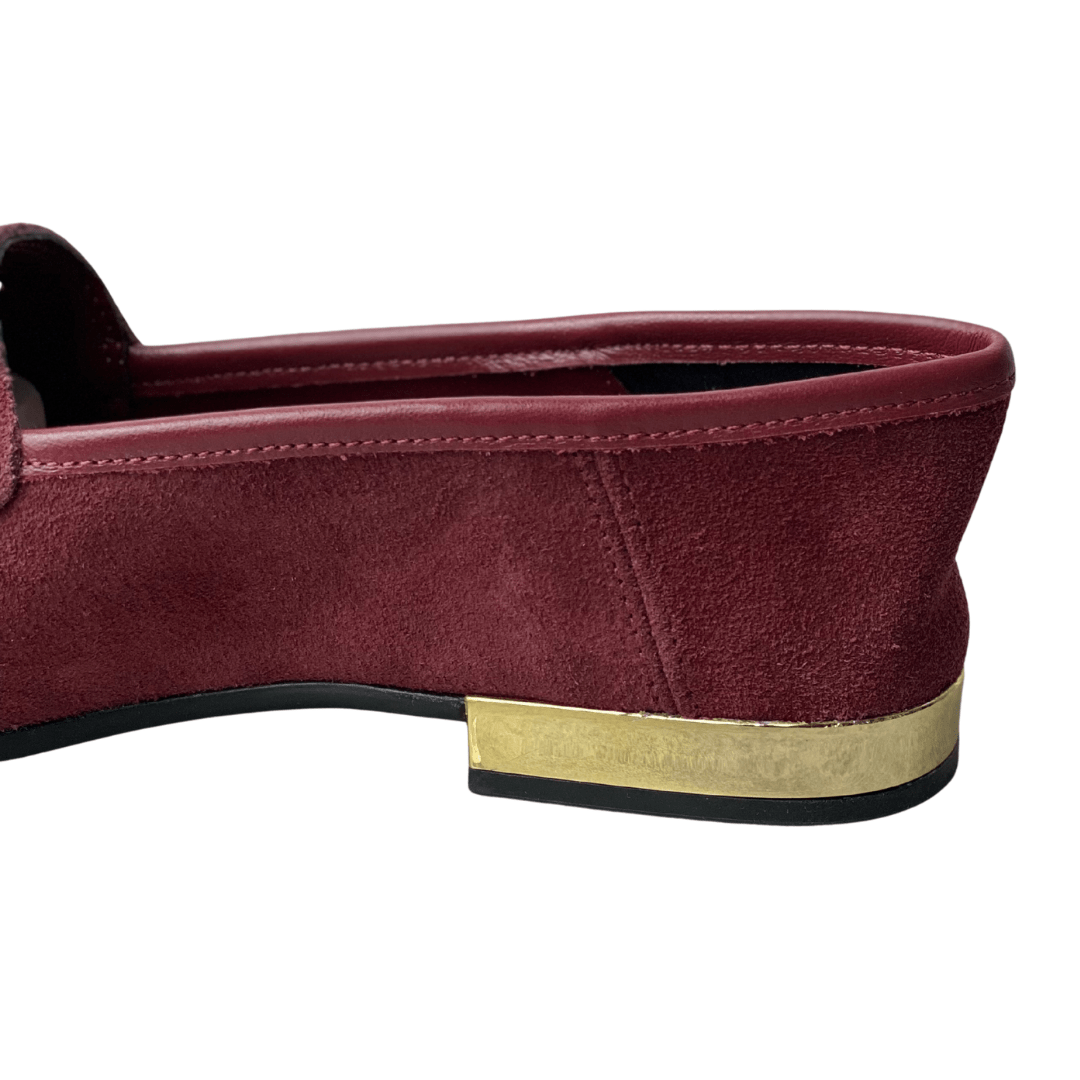 A Sapatilha Santinelli na cor Cabernet (Vinho) exala sofisticação. Seu design tipo mocassim é enriquecido por um adorno metálico dourado e um tassel clássico, resultando em um visual "confortável, estiloso e lindo".