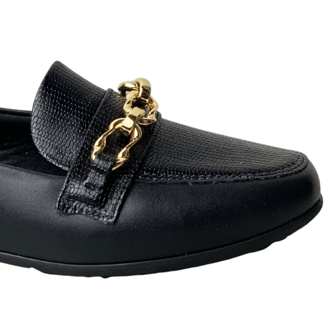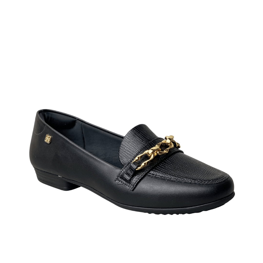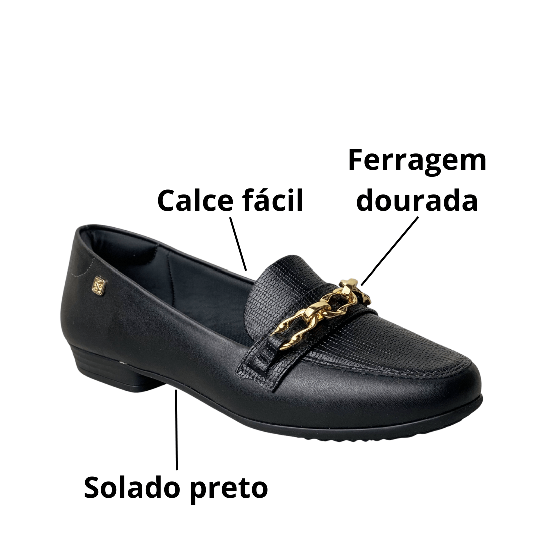 Estilo Marcante: O detalhe da corrente dourada sobre o cabedal funciona como uma joia para os pés, elevando o status de qualquer look básico.