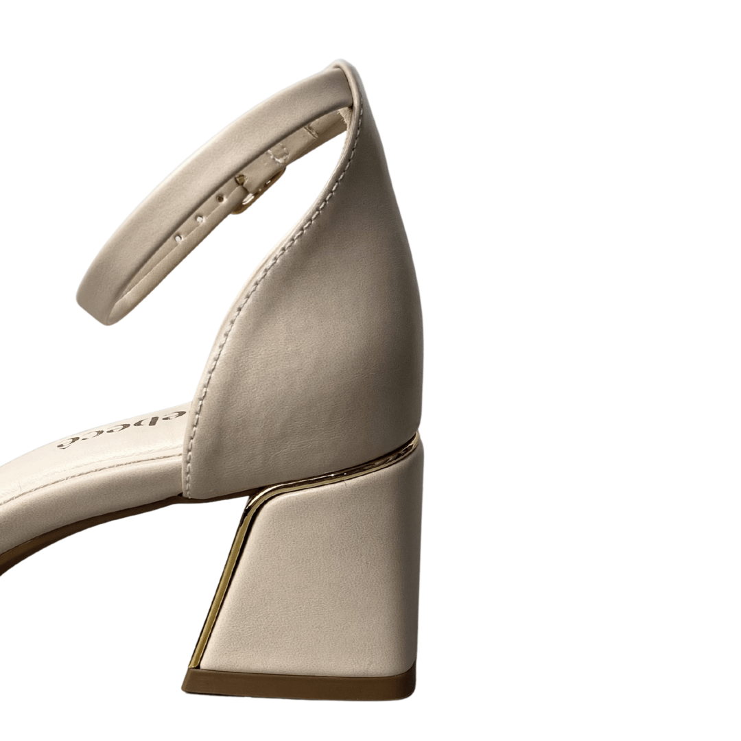 Salto: Médio, tipo bloco, com um detalhe metalizado dourado na face interna que adiciona brilho e exclusividade.