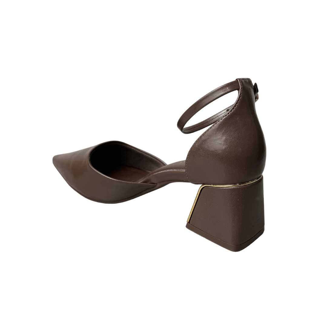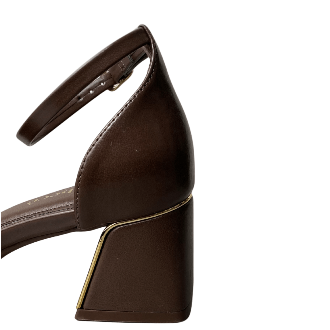 Salto: Médio, tipo bloco, com um detalhe metalizado dourado na face interna que adiciona brilho e exclusividade.