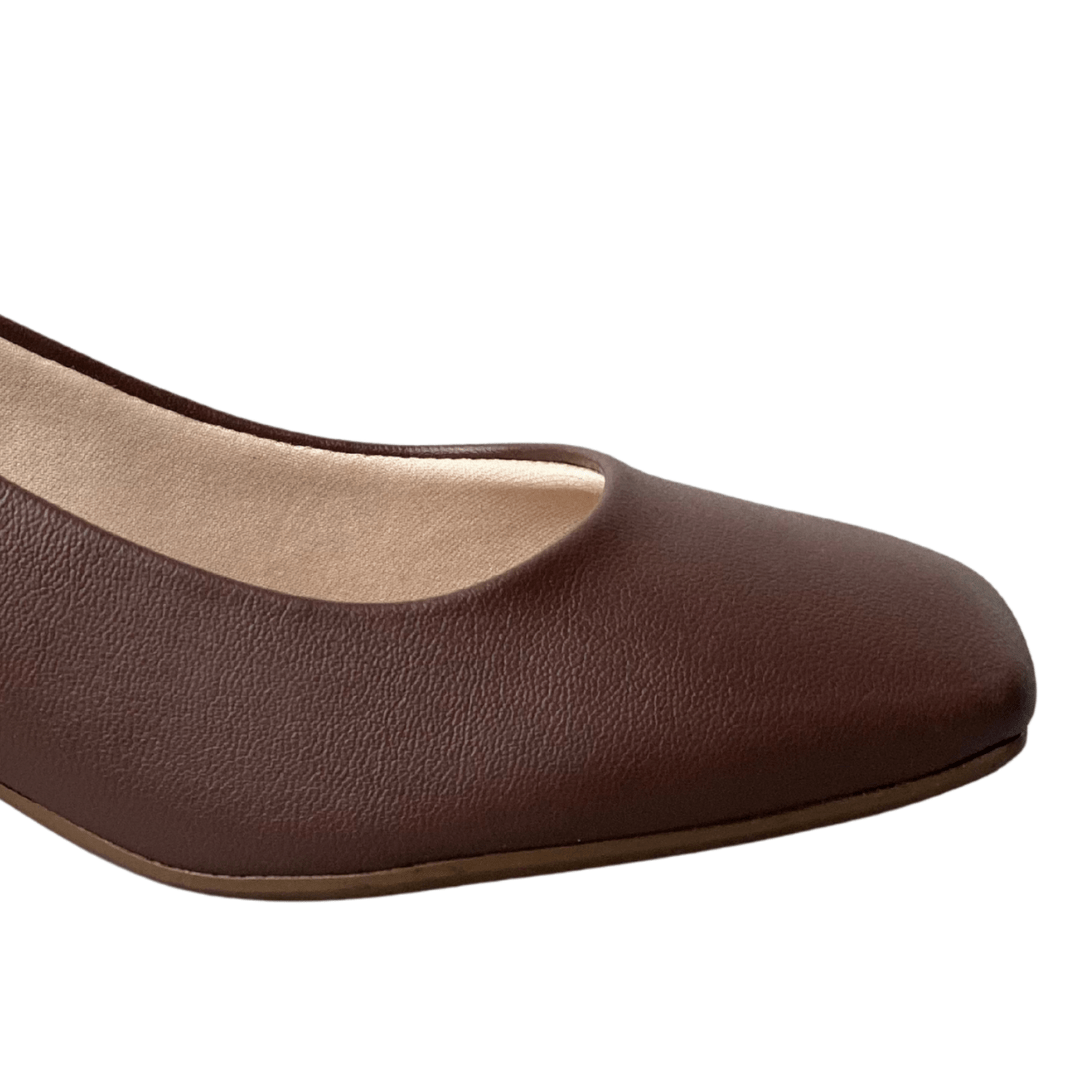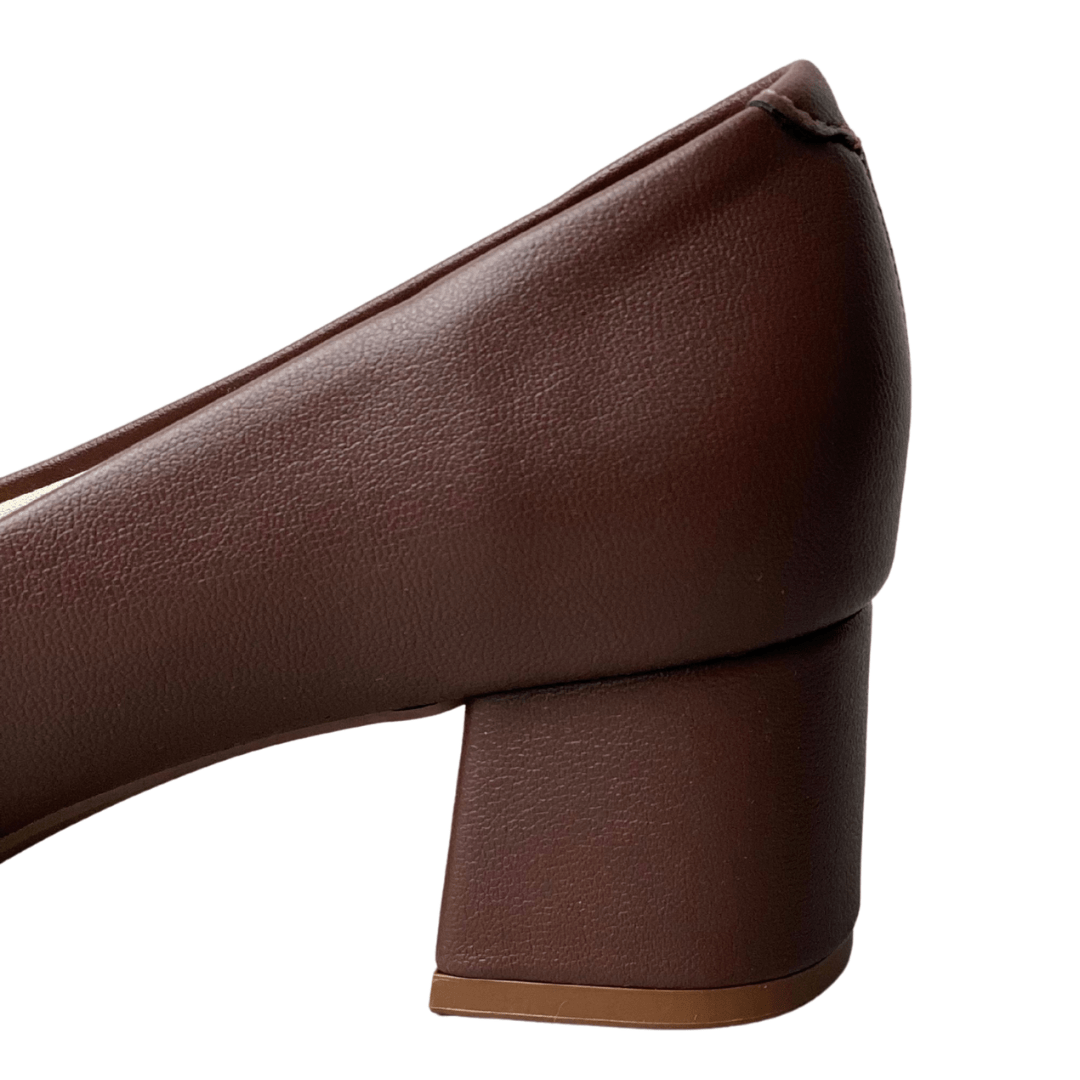 O Sapato Beira Rio apresenta um design minimalista e refinado em um tom de marrom chocolate profundo. Seu grande diferencial é a combinação entre o bico quadrado e o salto grosso, garantindo um visual contemporâneo que valoriza qualquer produção.