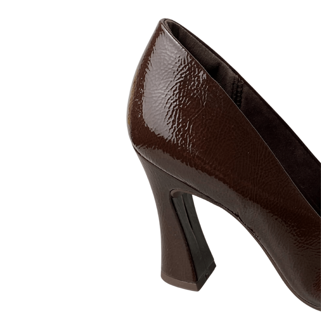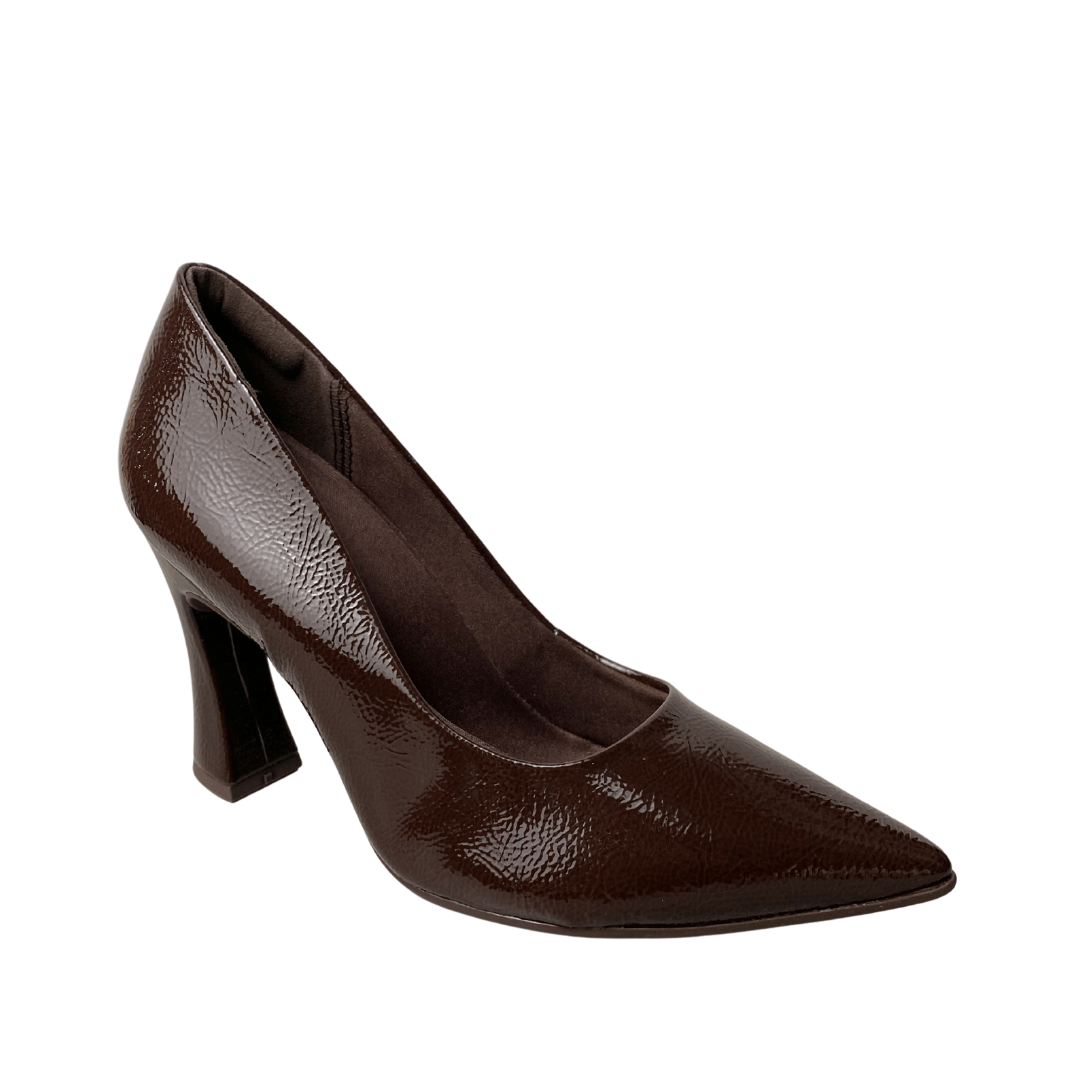 Brilho Sofisticado: O acabamento em verniz cacau (marrom profundo) traz uma profundidade luxuosa ao calçado, sendo uma alternativa moderna e elegante ao preto básico.
