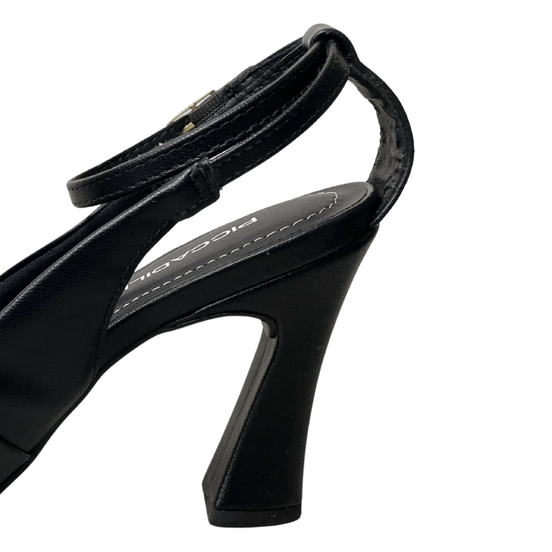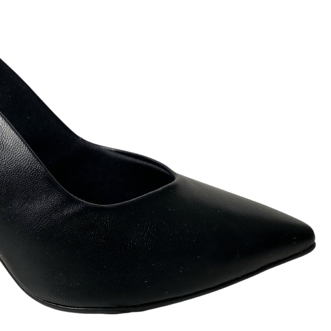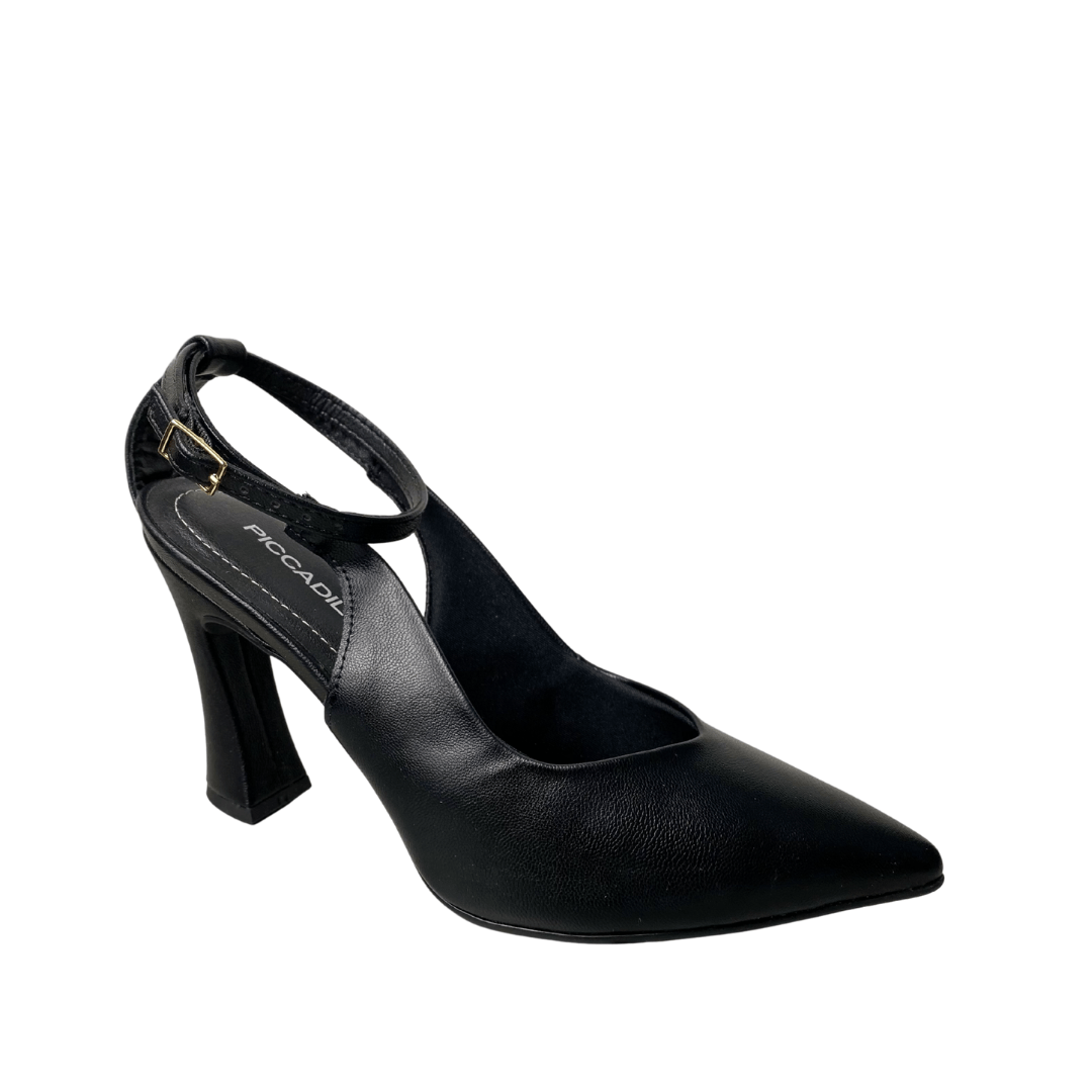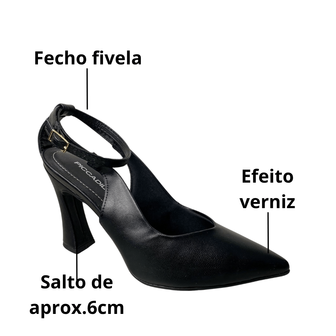 Modelo: Sapato de bico fino com calcanhar aberto e tira de suporte (estilo Slingback/Mary Jane moderno).
