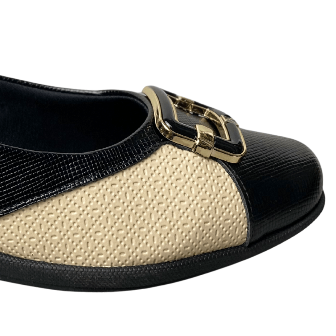 Design Inteligente: O mix de texturas (liso e trabalhado) aliado ao recorte em tom bege cria um contraste visual que emagrece e valoriza o pé.