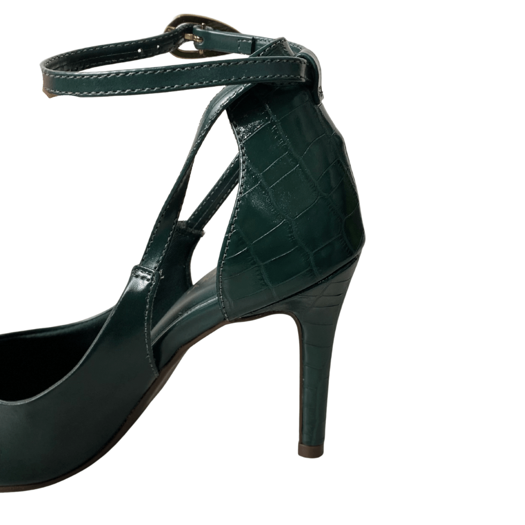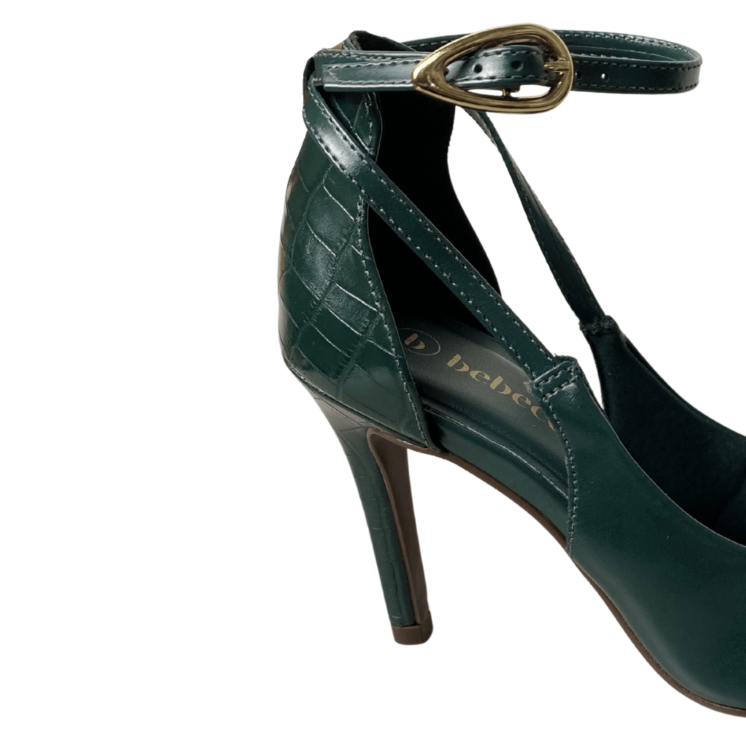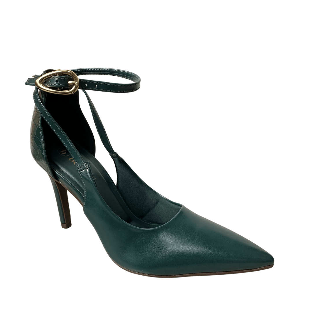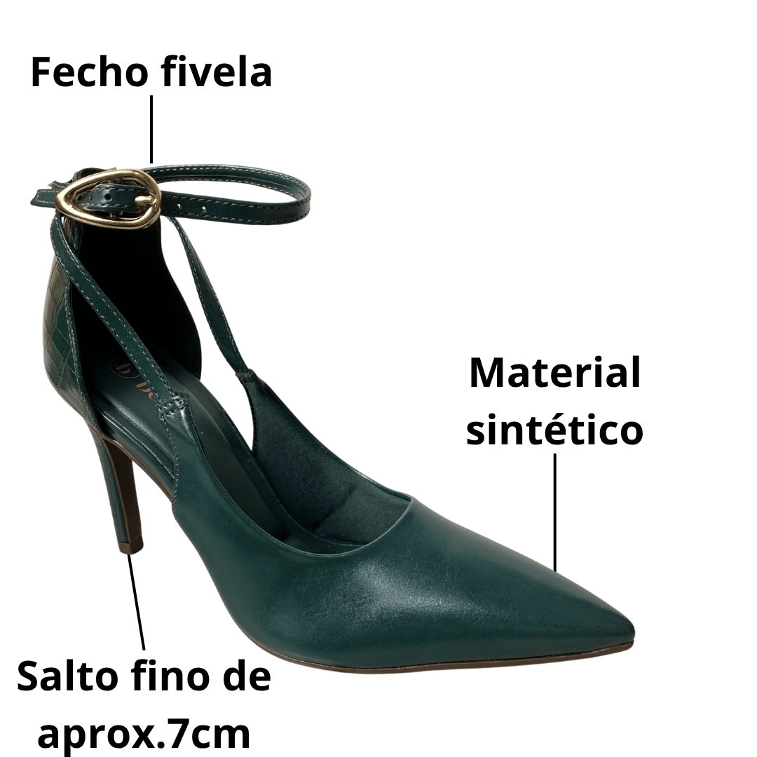 Design: Modelo scarpin com bico fino e abertura lateral, apresentando tiras finas que se cruzam e envolvem o tornozelo.
