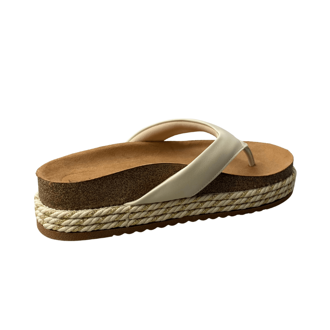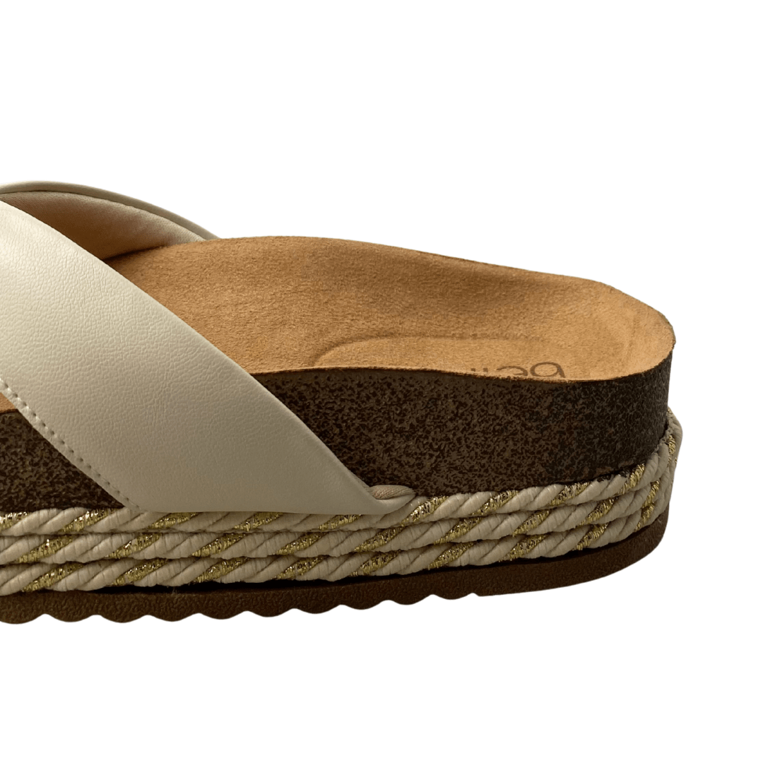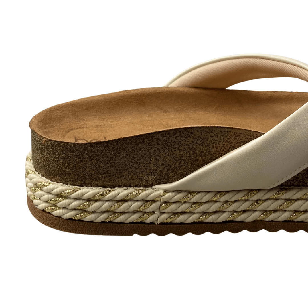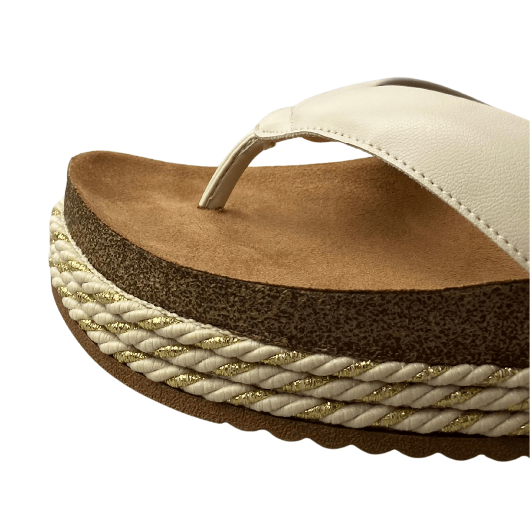 Design: Tamanco estilo plataforma com tiras largas em off white e detalhe de corda com fios dourados na entressola, que remetem ao estilo rústico-chique.