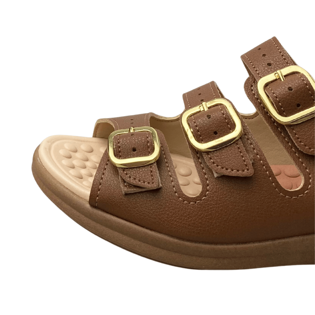 Ajuste ideal graças às três fivelas douradas, que além de estilosas, permitem adaptar ao formato dos pés.