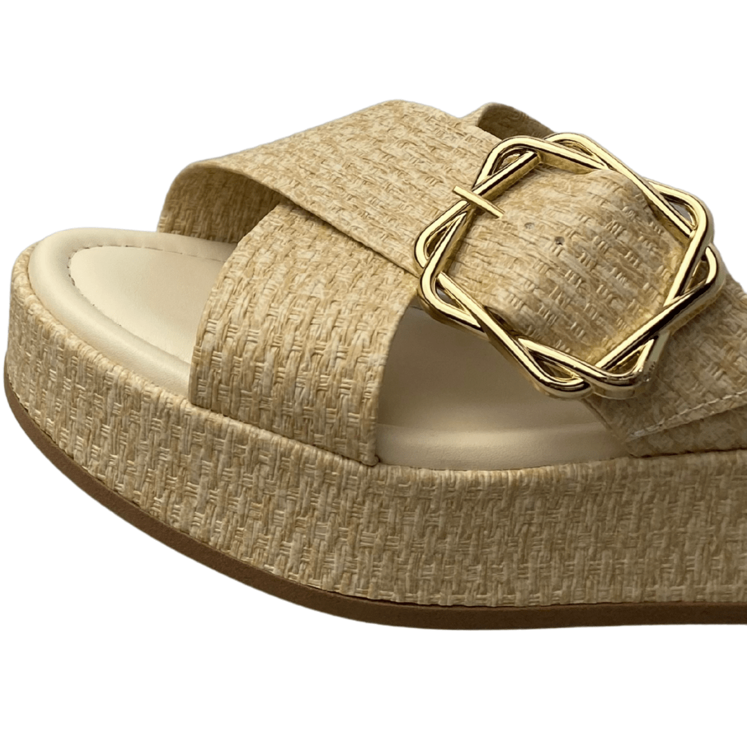 Tiras: Cruzadas, largas, com textura leve e fivela dourada decorativa