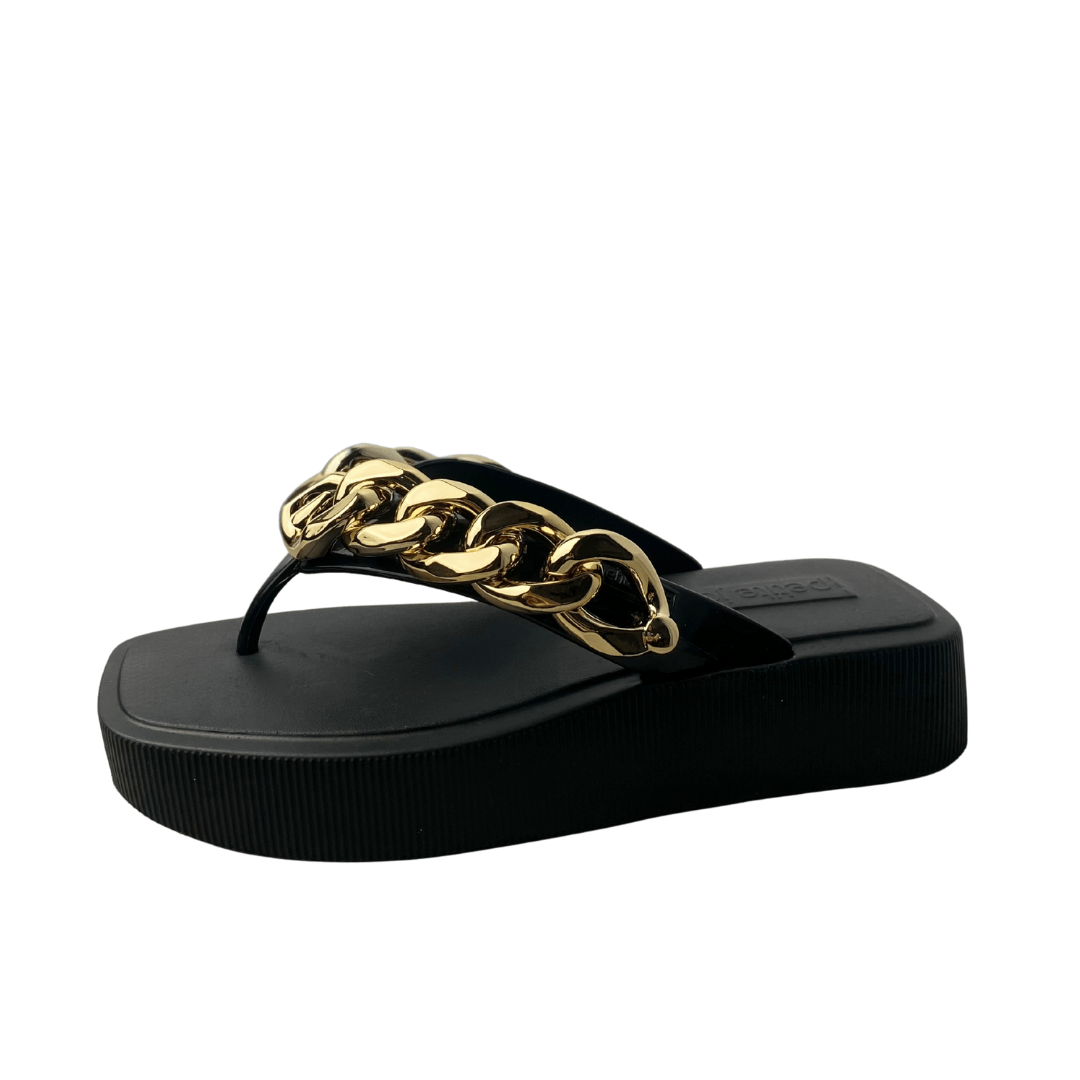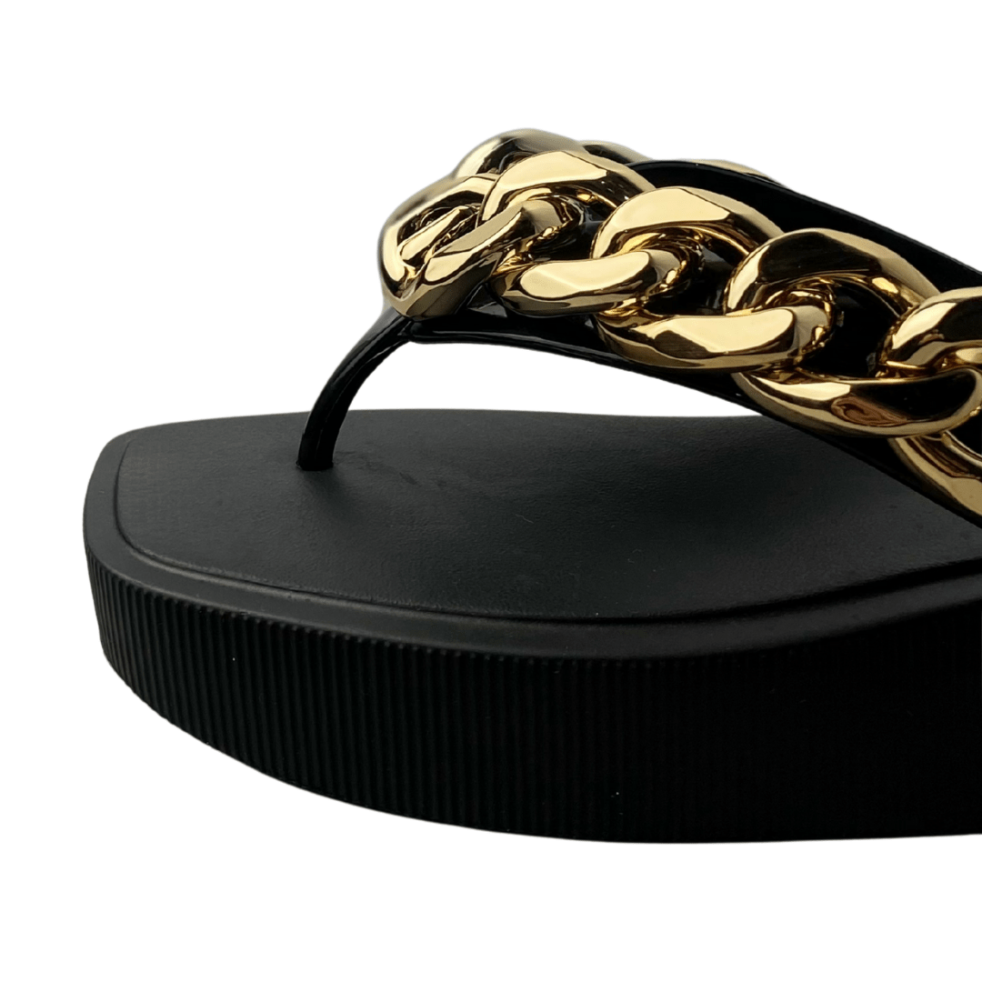Design: Tamanco estilo rasteira com tira grossa e aplicação de corrente metálica dourada que traz sofisticação.