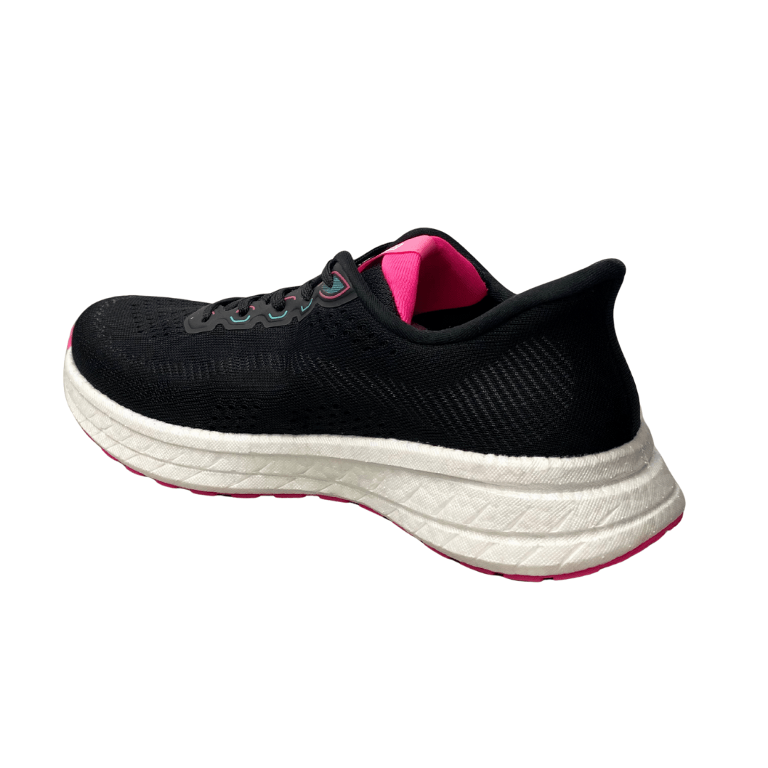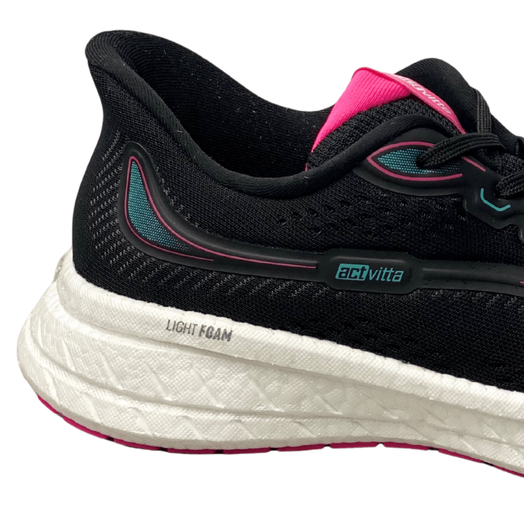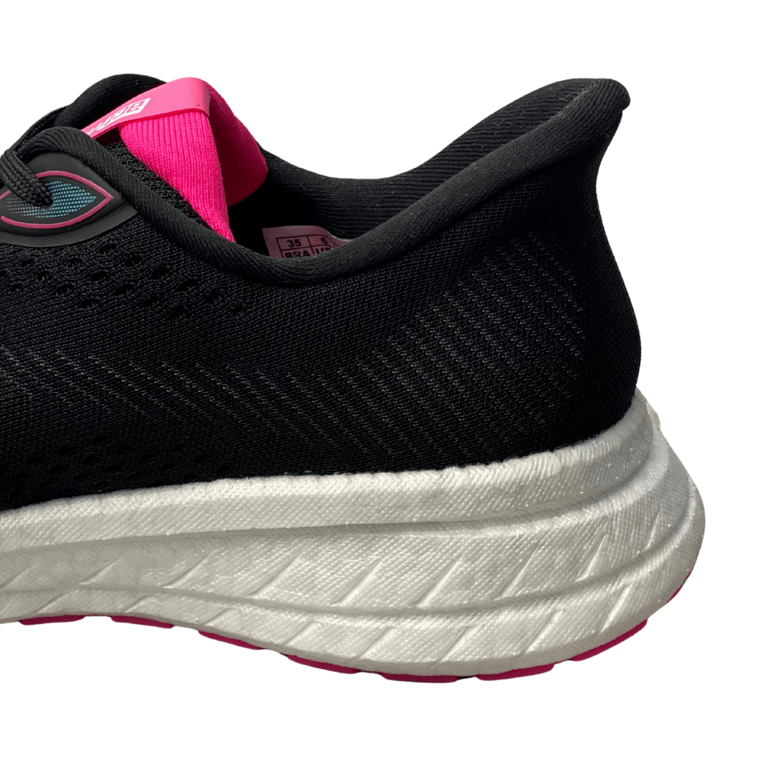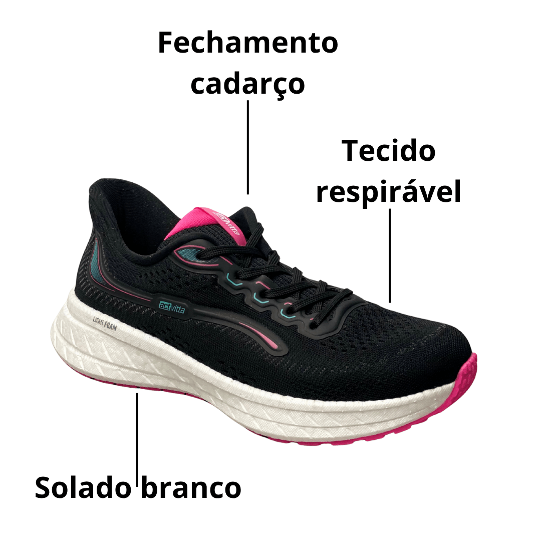 Cor: Preto predominante, com detalhes vibrantes em Pink (forro, lingueta e solado) e Verde/Azul Água (passadores de cadarço). Entressola na cor branca.