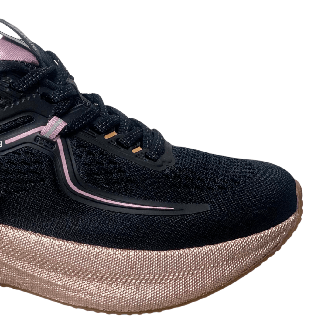 Estilo Esportivo Moderno: O contraste do preto com os detalhes em rosa e a sola metalizada cria um visual contemporâneo e feminino.