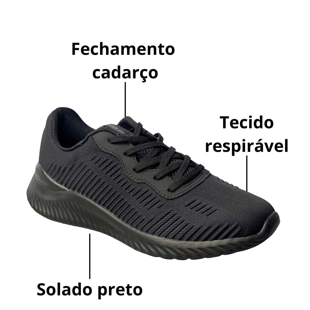 Cor: Preto total (preto no cabedal, solado e cadarço).