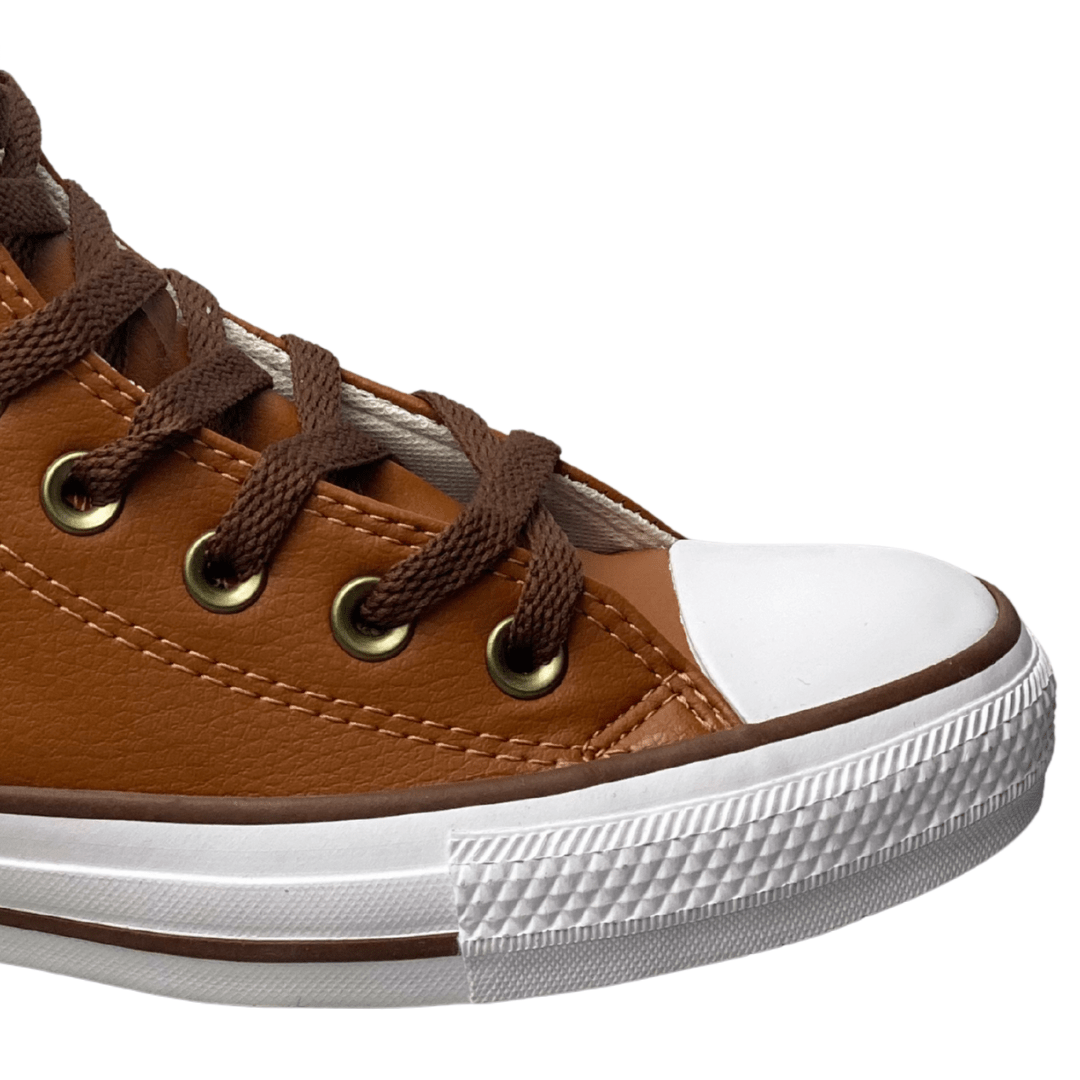 Solado: Borracha clássica da Converse na cor branca, com listras pretas laterais e base marrom.