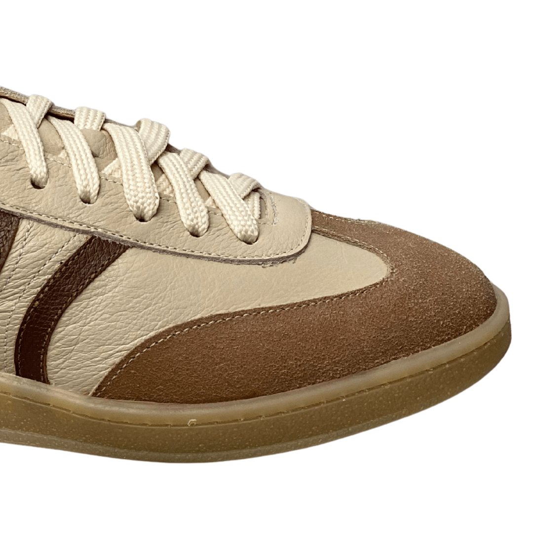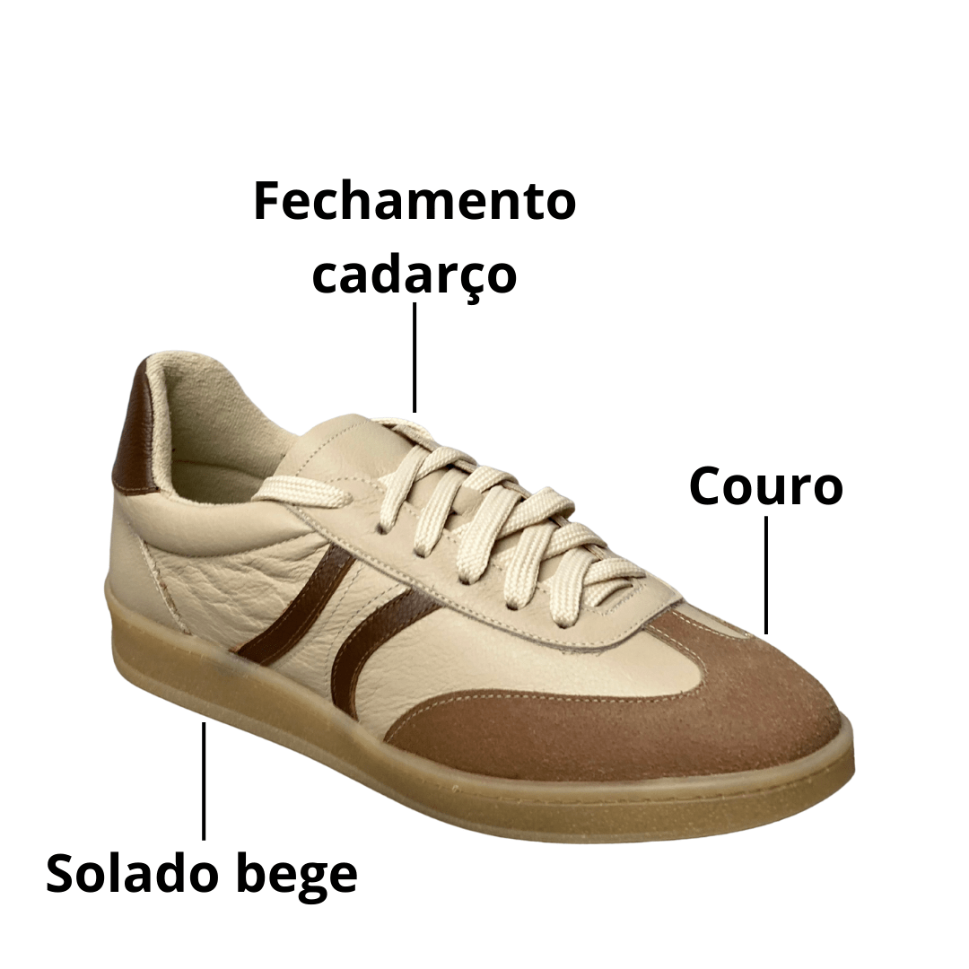 Cores: Predominante em Taupe/Bege com detalhes (listras e calcanhar) em Marrom.