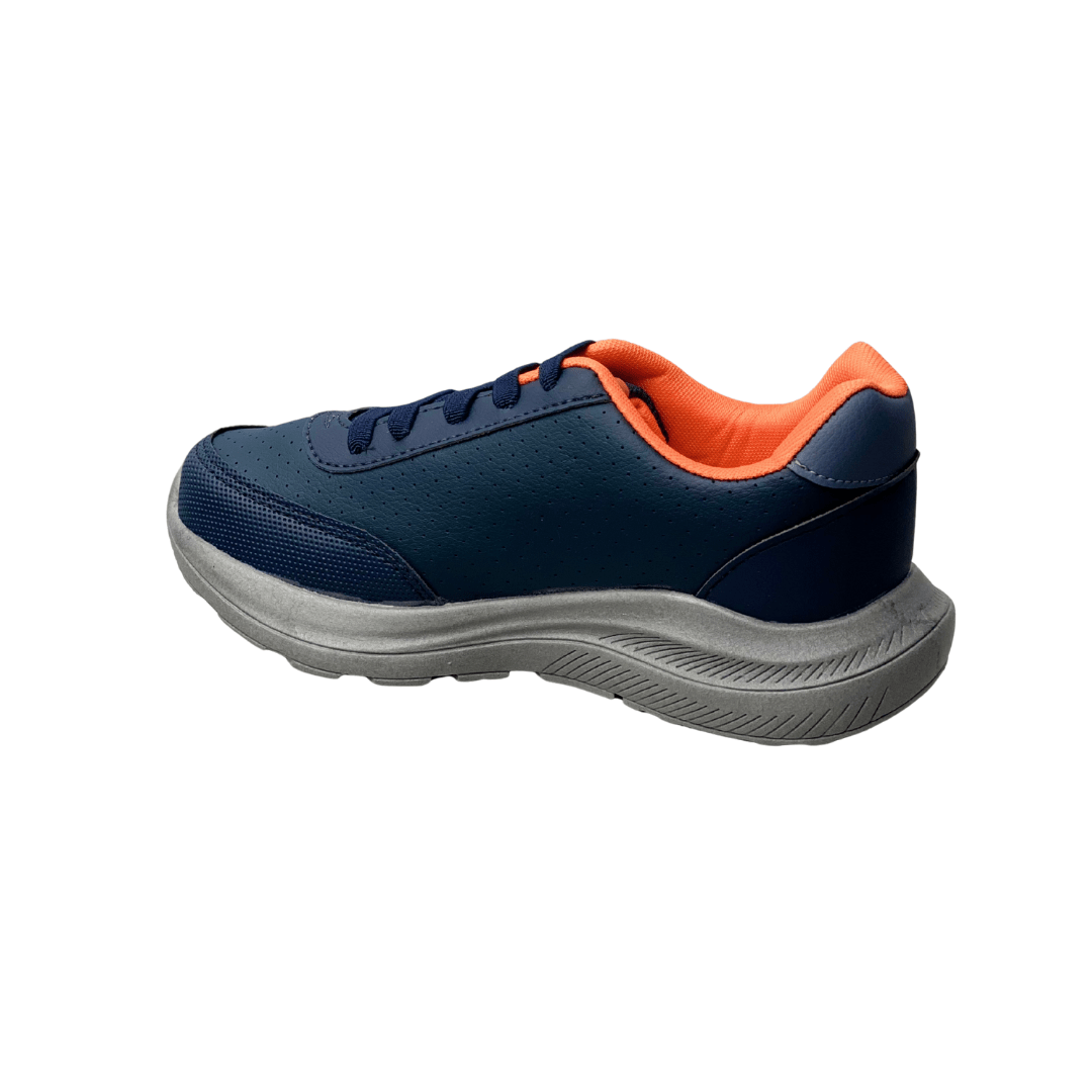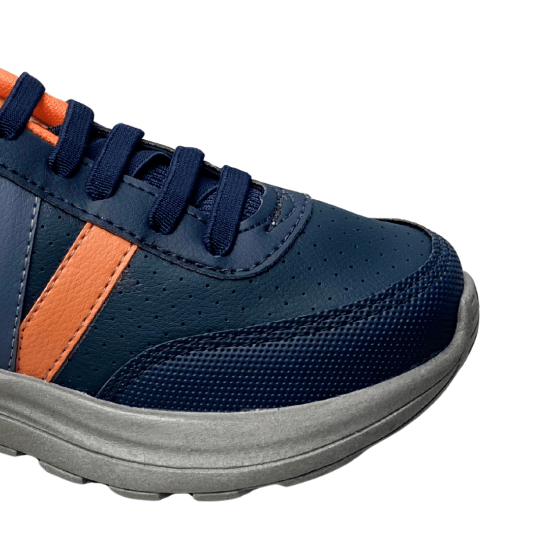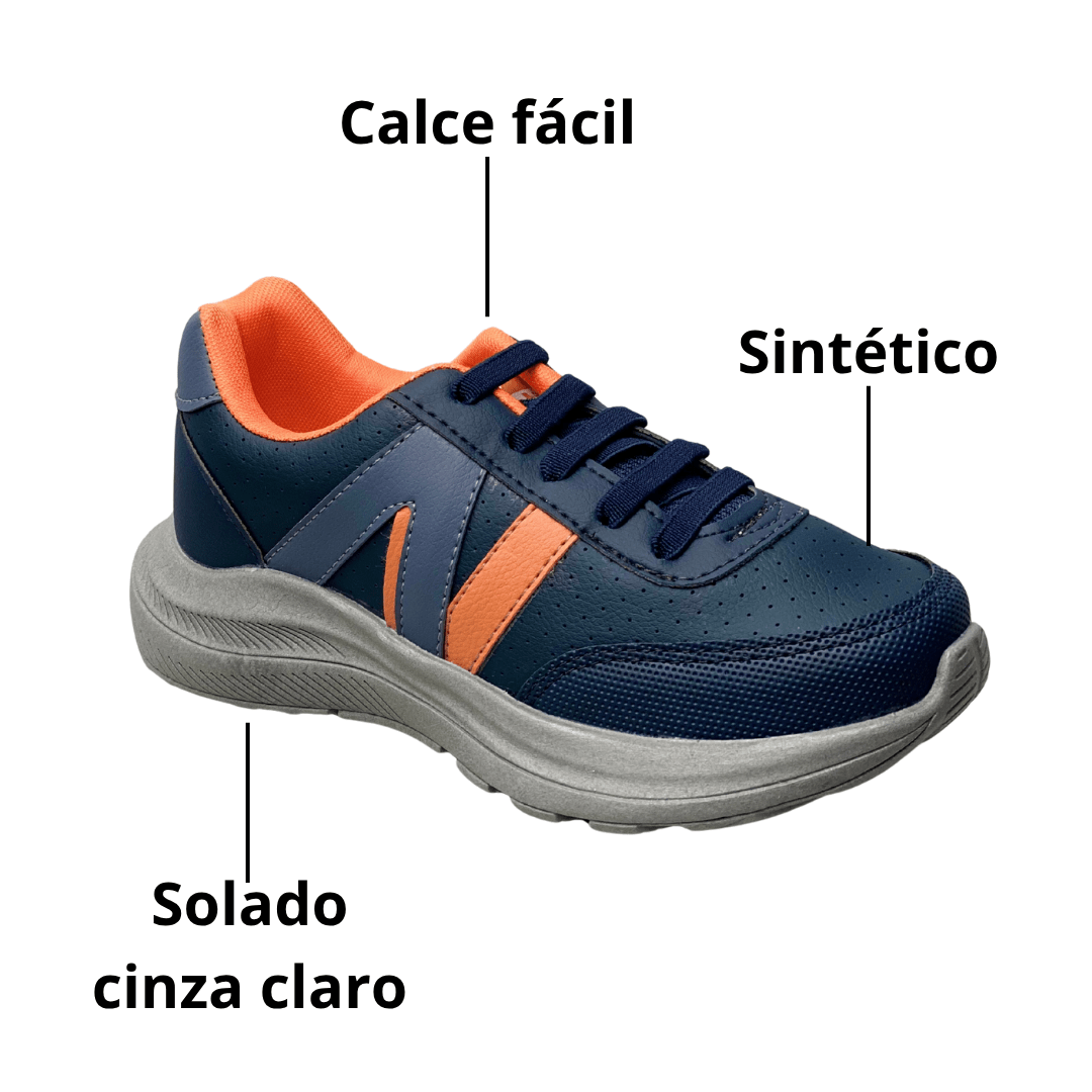 Cor: Azul marinho com detalhes em laranja e solado cinza.