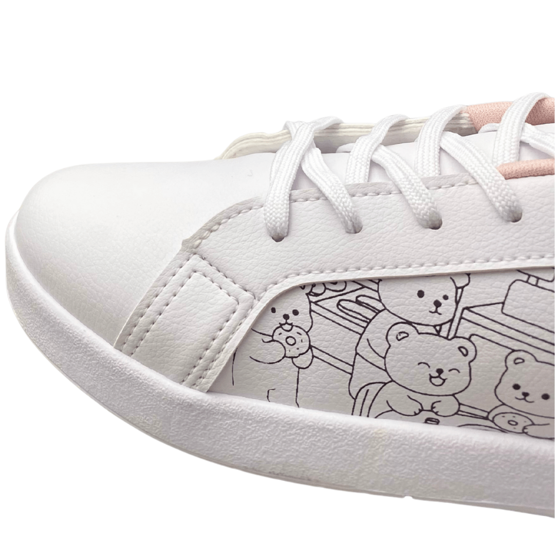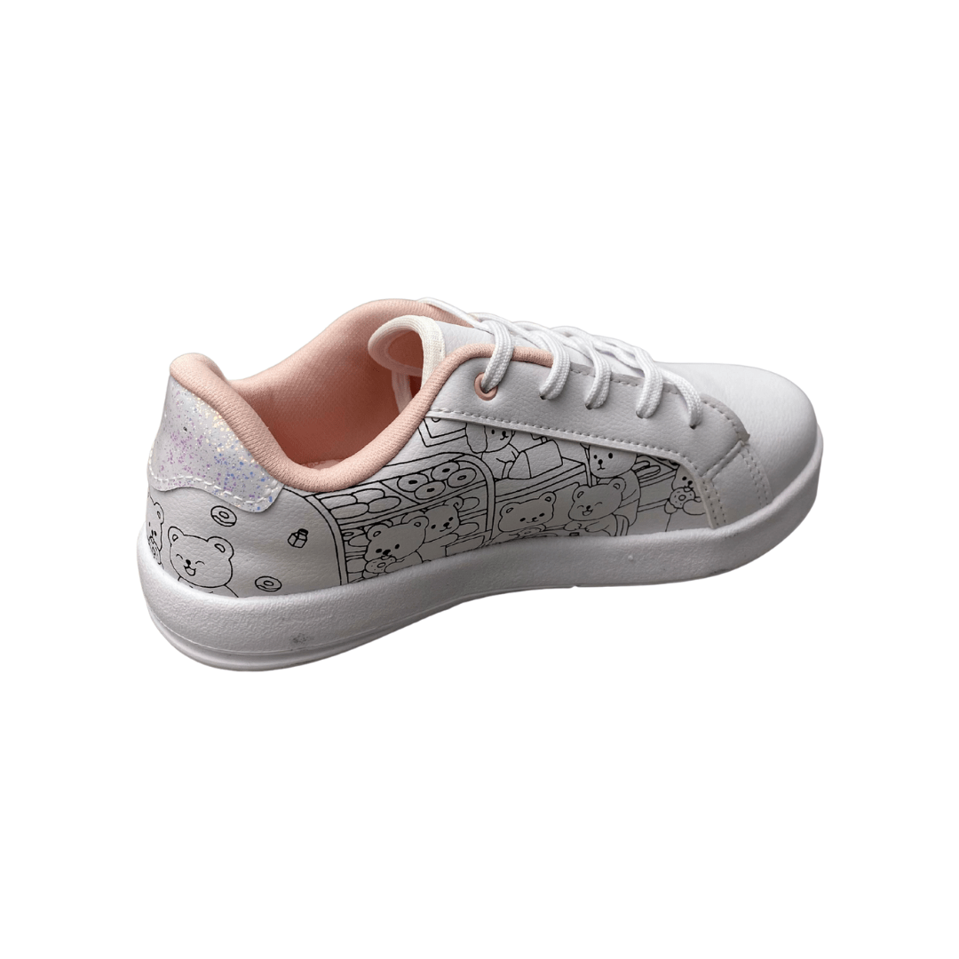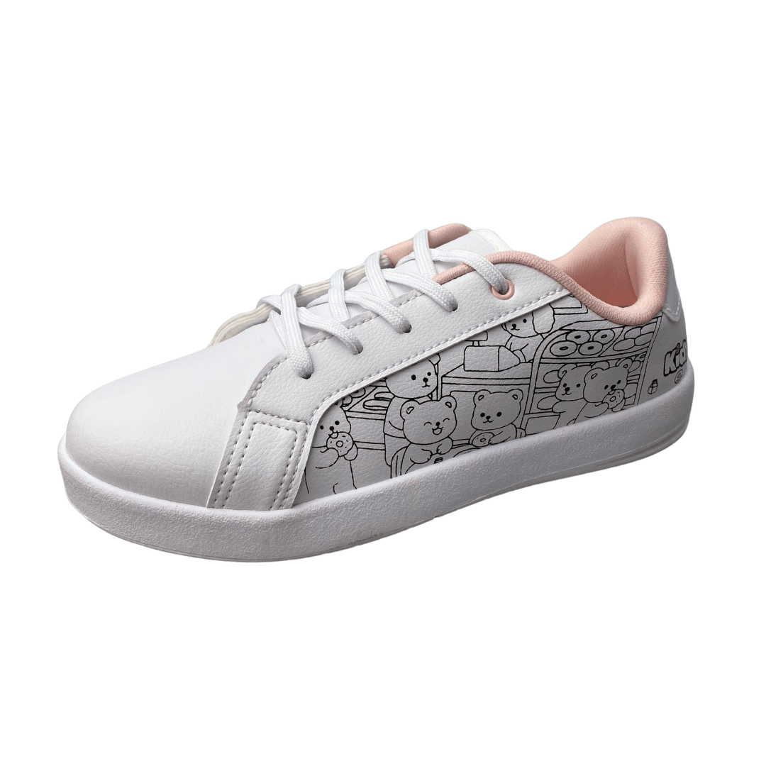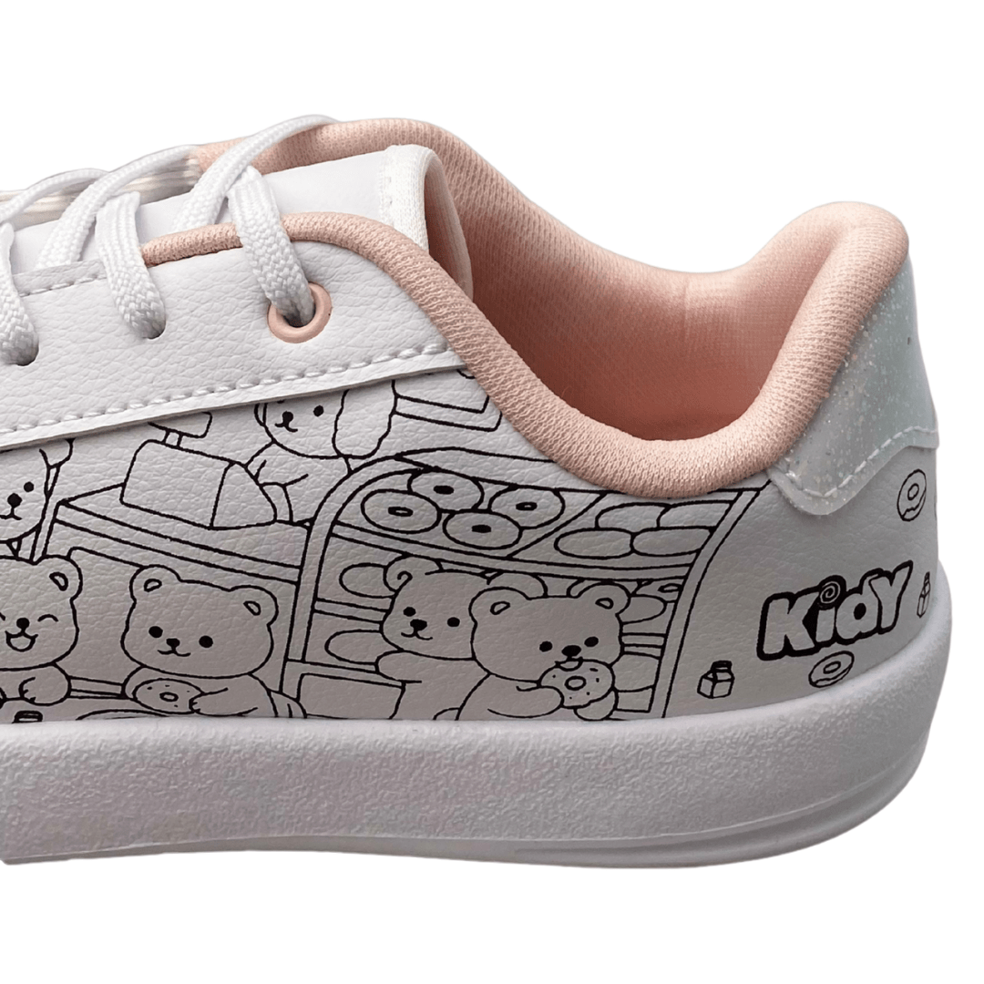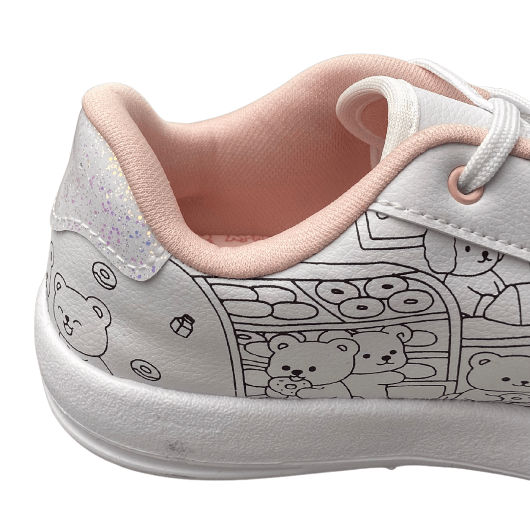 A criança pode personalizar a estampa colorindo os desenhos no lateral do tênis.