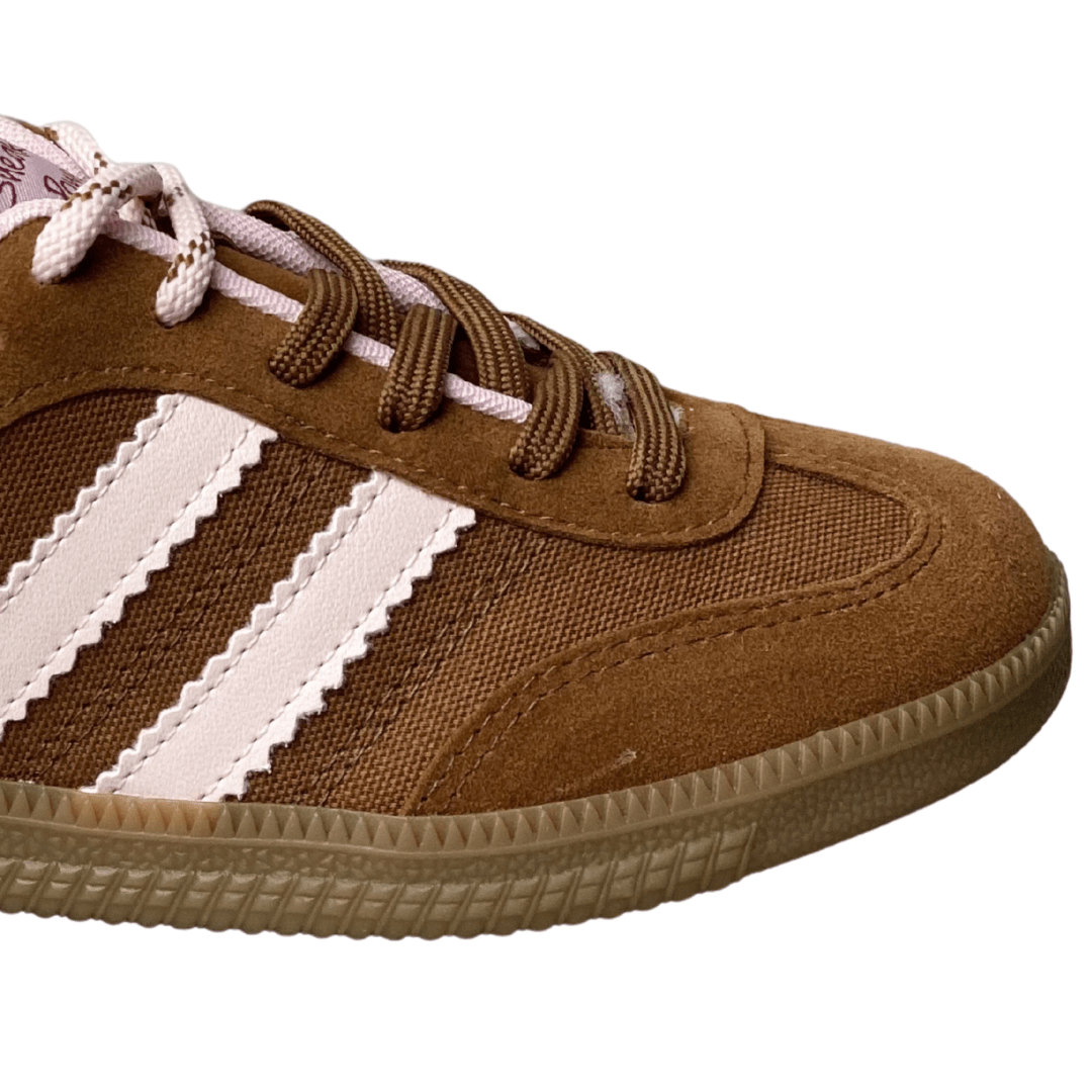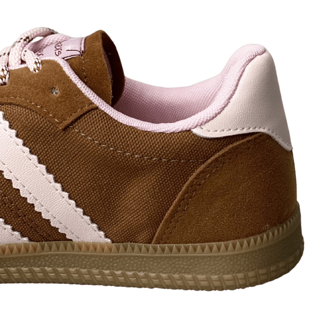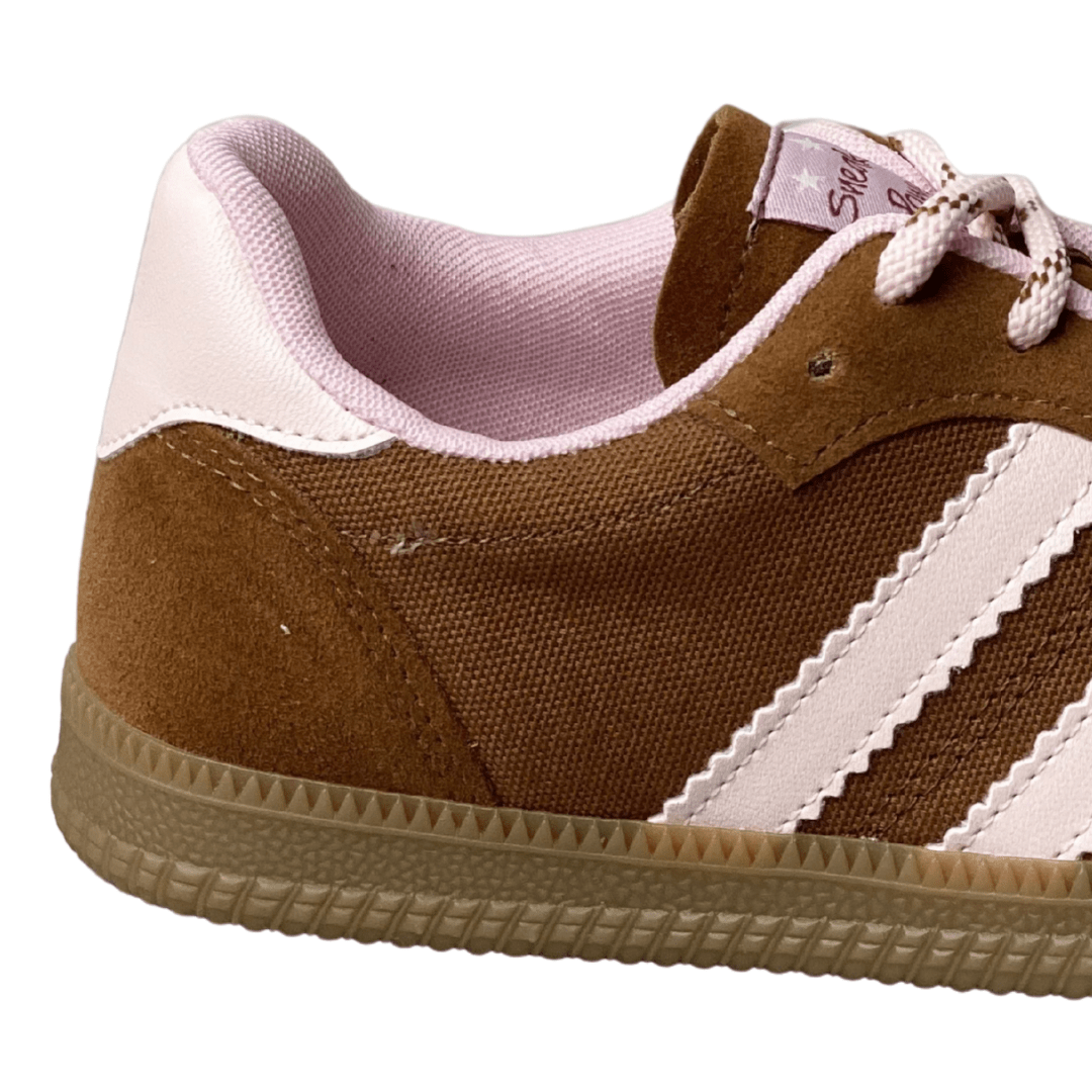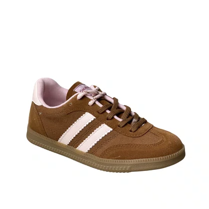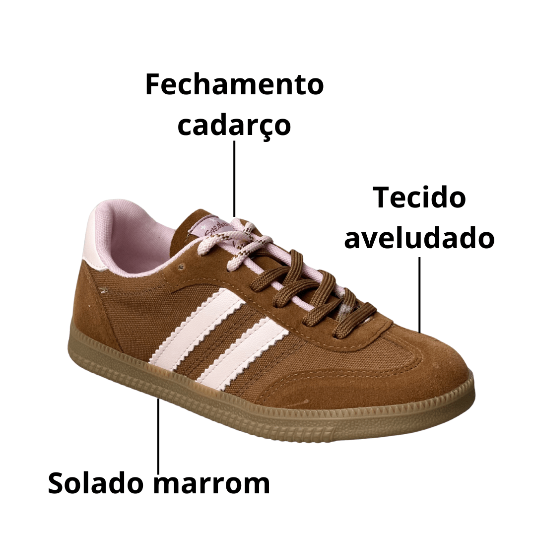 O Tênis Mini Sua Cia apresenta uma combinação sofisticada de cores, onde o tom whisky (marrom) do cabedal harmoniza perfeitamente com as listras e o forro em rosa claro. Seu acabamento texturizado e solado em borracha conferem um ar esportivo e casual ao mesmo tempo.