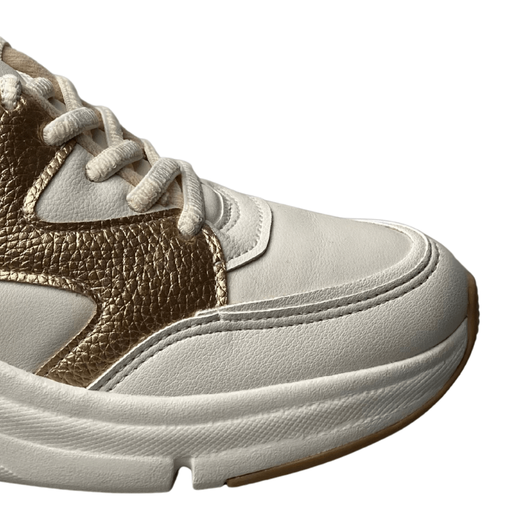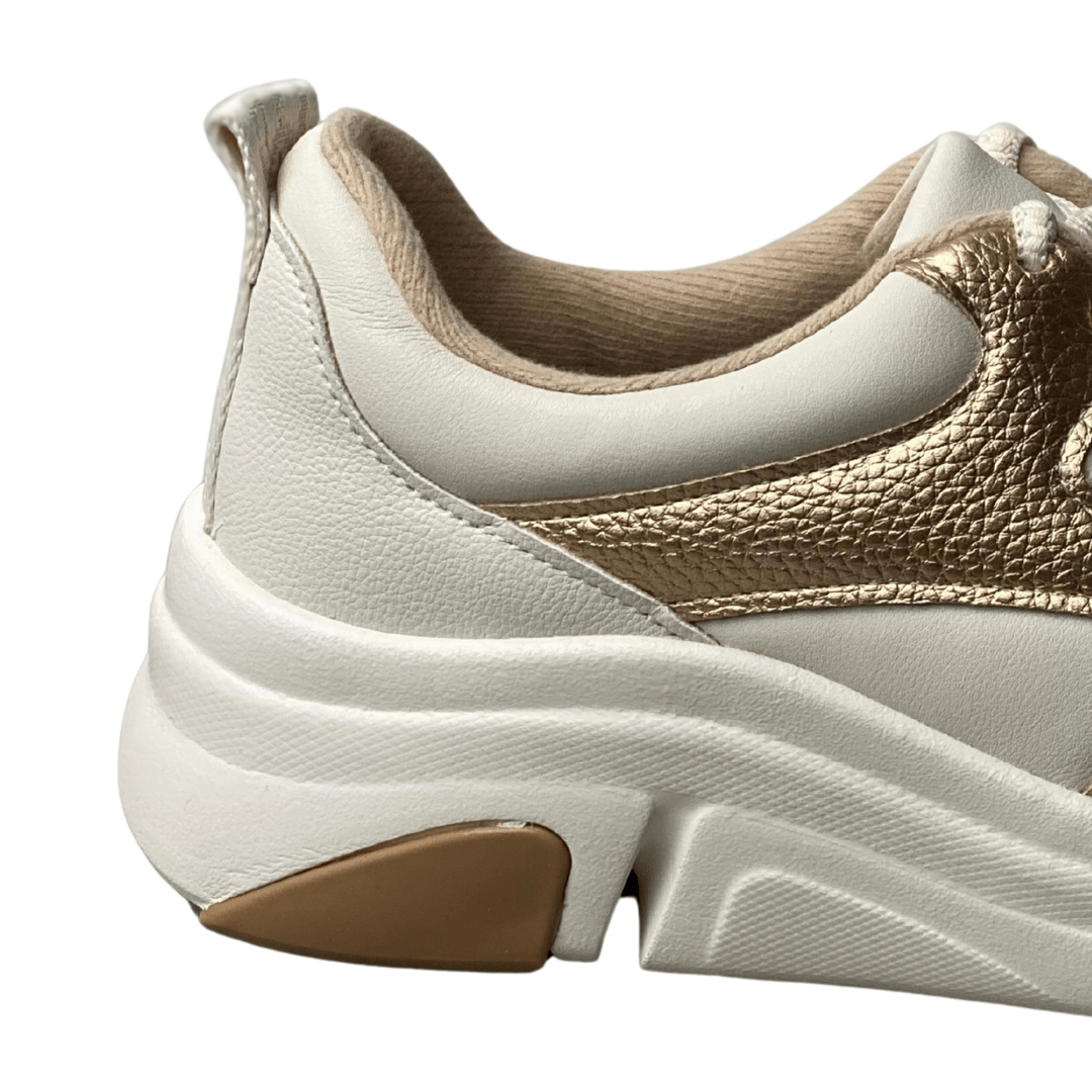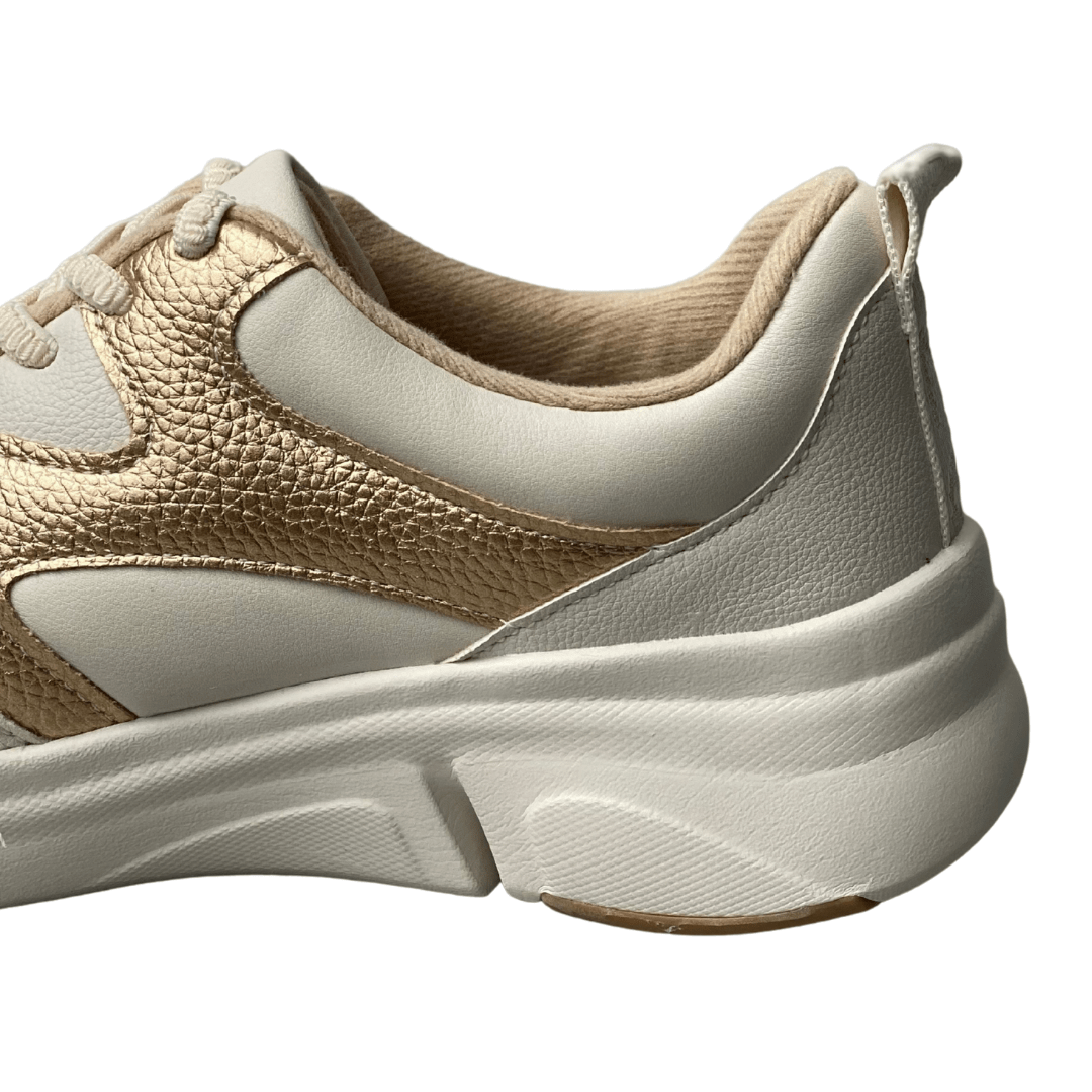 Solado: Borracha antiderrapante branca com detalhes em tom caramelo para maior segurança.